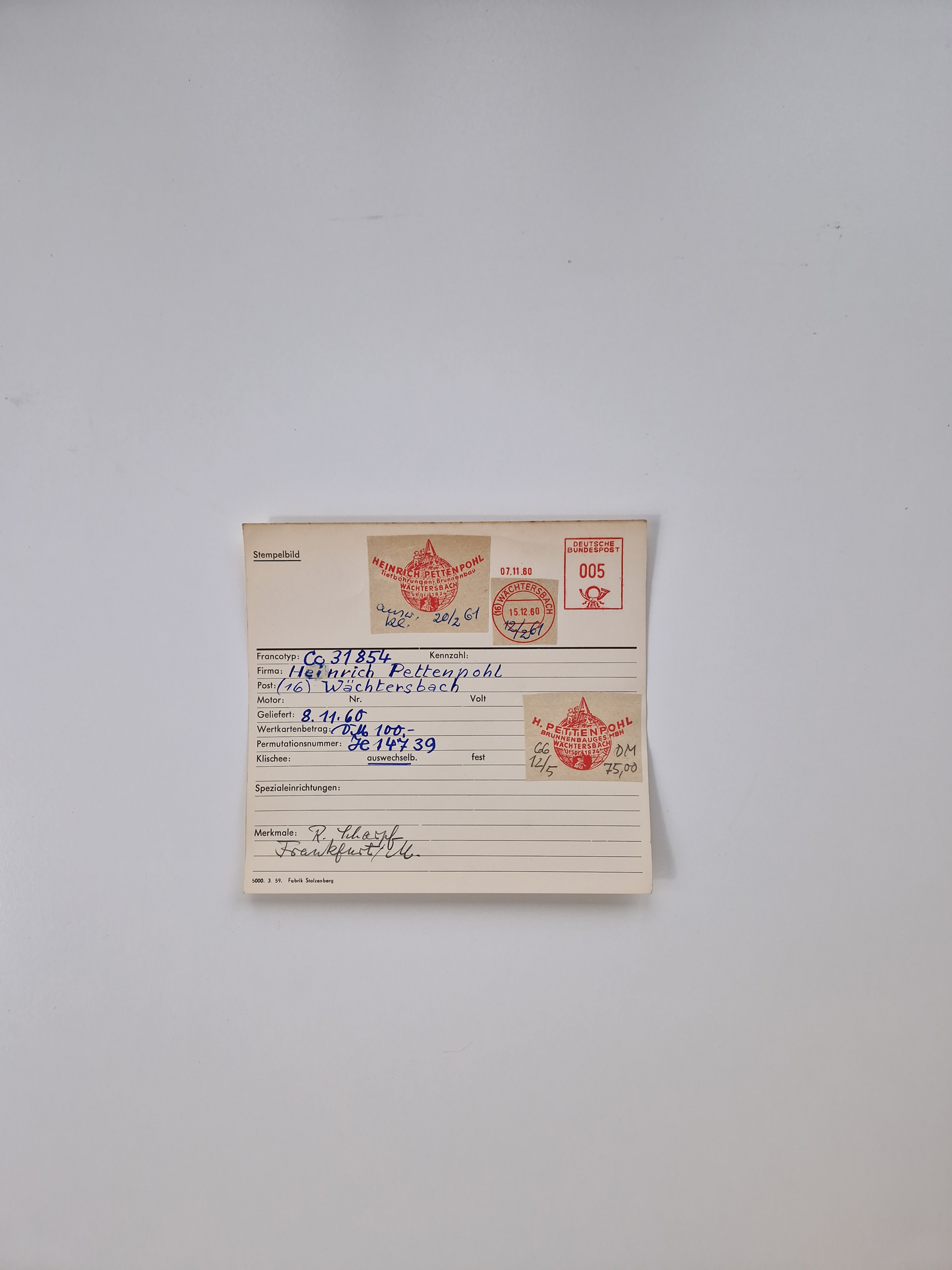 1946/69, umfangreicher Bestand "Absenderfreistempel Muster-Abschläge” auf geschätzt 5000 Stammkarten der Firma "Francotyp”, der Schwerpunkt liegt bei Bund, dazu etwas Ausland. Dabei nur verschiedene Firmen, Typen usw. mit interessanten Motiven und weiteren Besonderheiten, aus dem Firmen-Archiv stammend.
