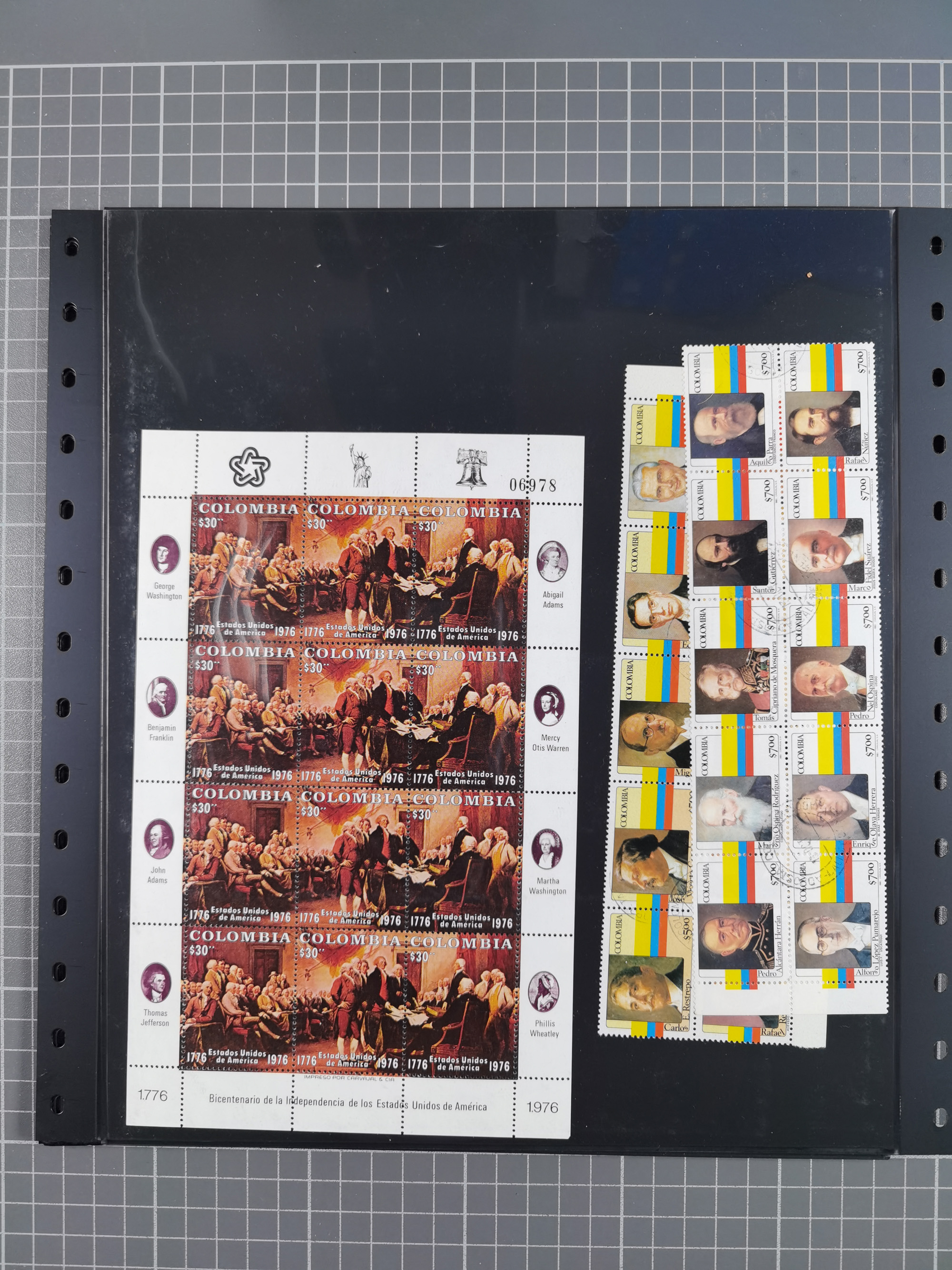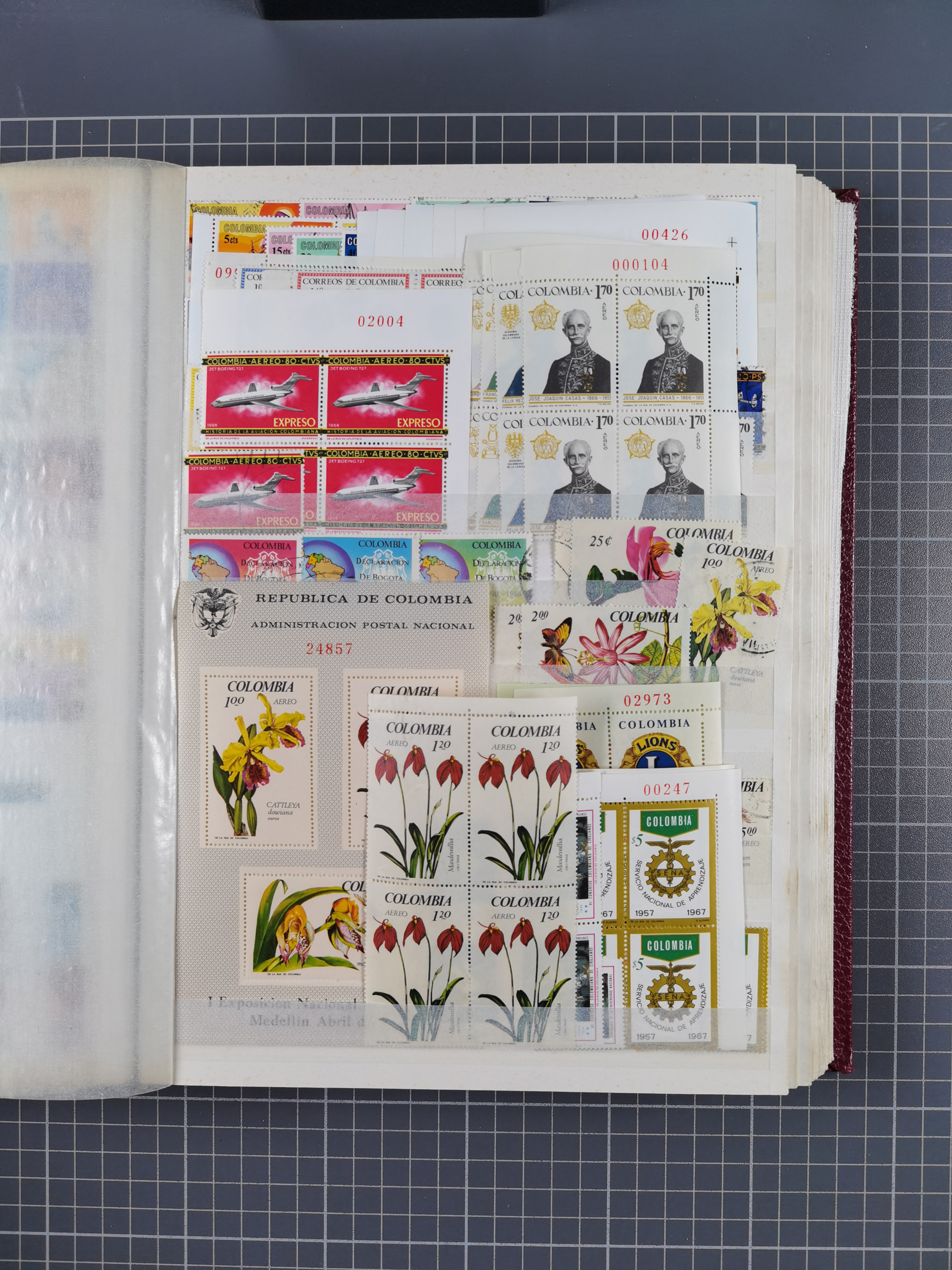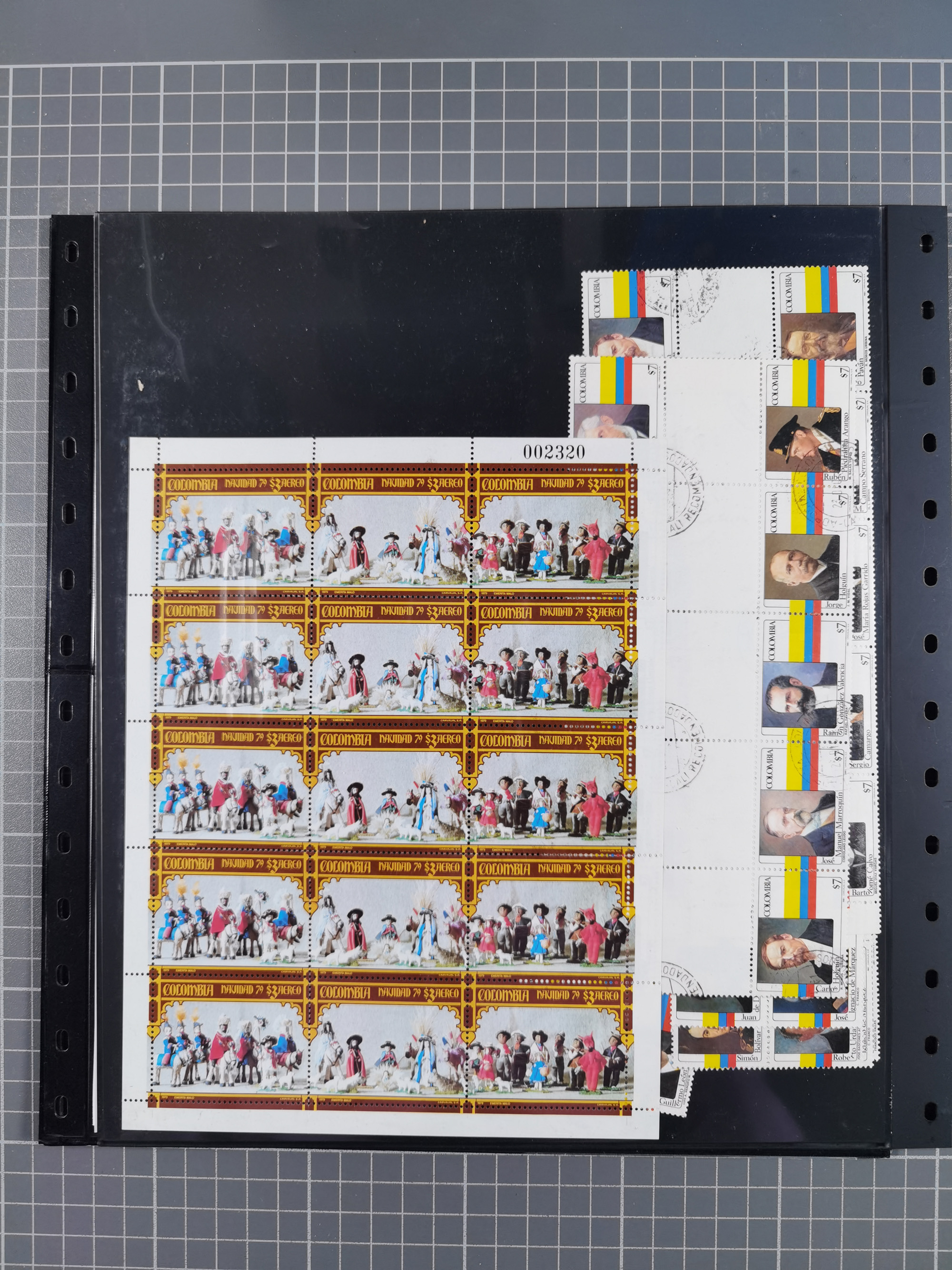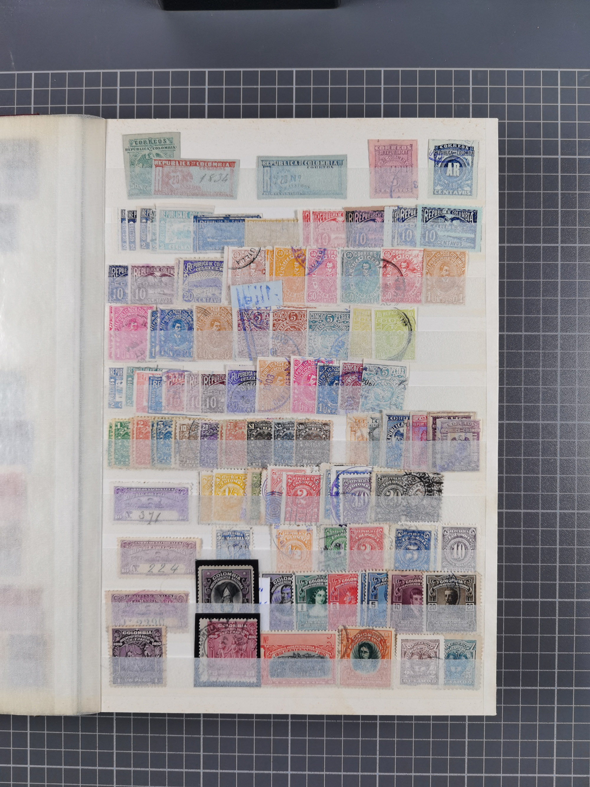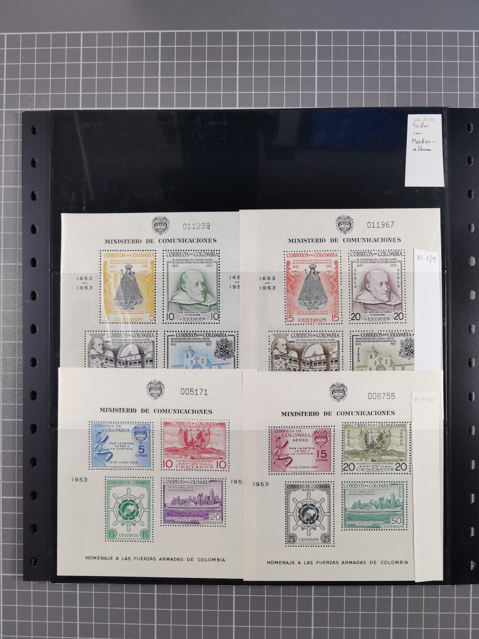 1917, Camilo Torres 1 c., plate proofs in black, green, sepia and orange, each in block of ten without gum, the orange block with horizontal crease affecting the bottom row, the sepia one toned and a few minor faults, otherwise fine, scarce assembly