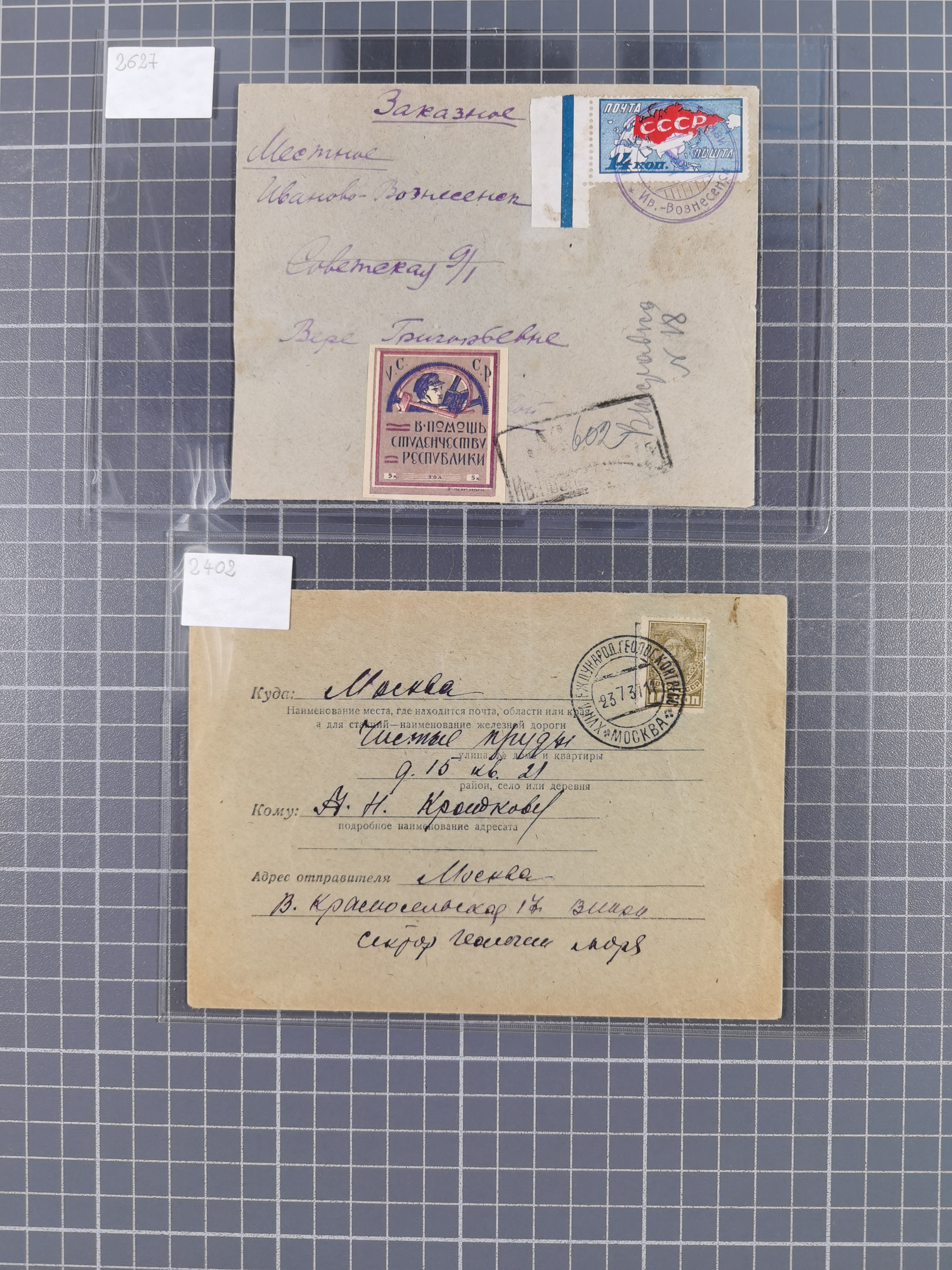 1927/39, Temporary Exhibition Special Postmarks, impressive group of 8 covers and cards, some from the famous Blekhman correspondence, many scarce items throughout, noted 1927 registered cover with rare "IV.(ANOVO)-VOZNESSENSK EXHIBIT”, 1937 envelope with very rare cds "XVIIth INTERNATIONAL GEOLOGICAL CONGRESS MOSCOW”, 1927 postal stationery card with very rare cds from the 10th Anniversary of Soviet Construction Exhibition, 1939 two illustrated card and special envelope with the All Union Agricultural Fair special cancellation "MOSCOW BCXB”, etc., mostly in very good condition. A rare specialist assembly