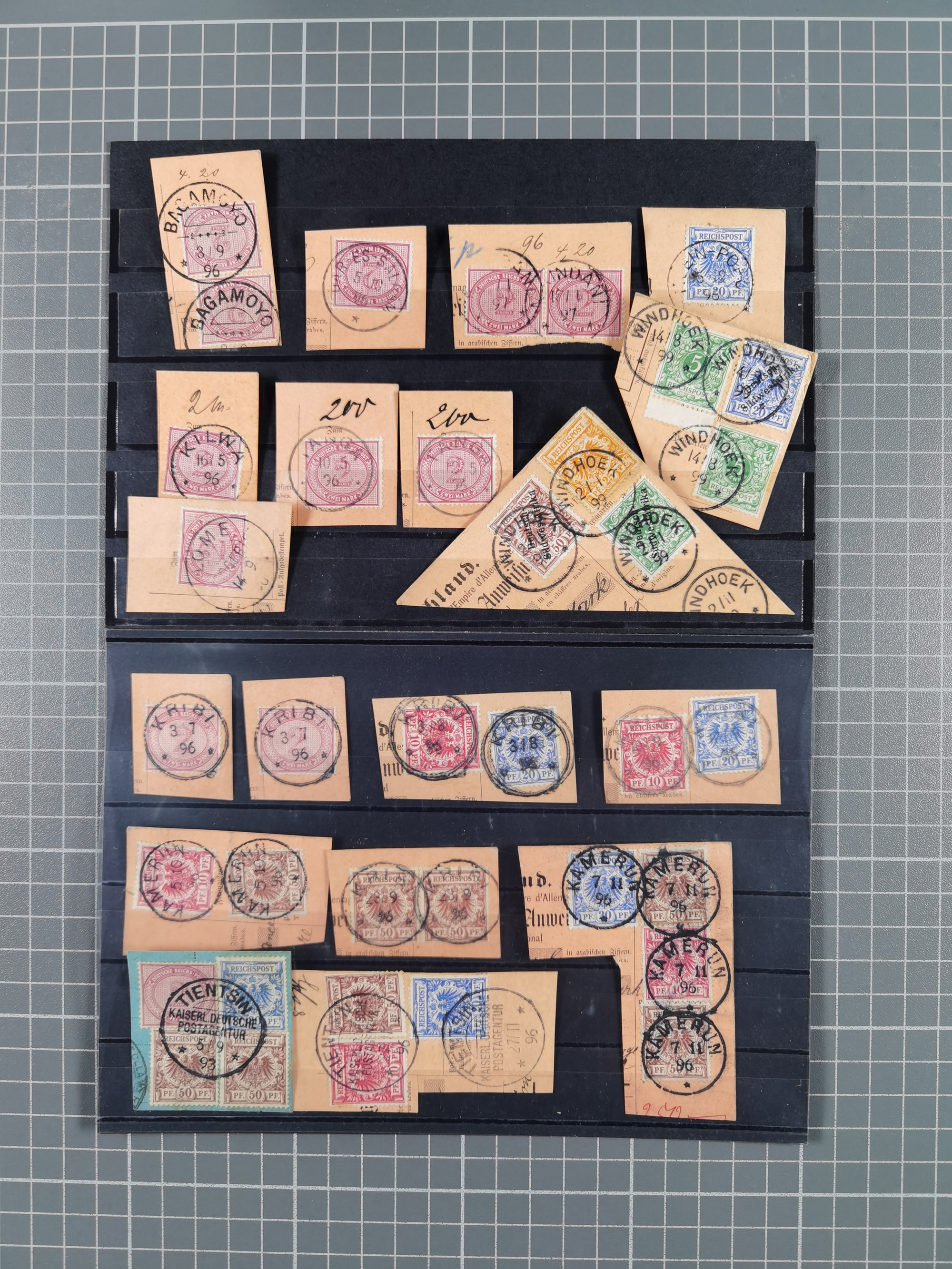 u.a. DP China Mi.-Nr. 7II ungebraucht (sign. Bothe BPP), DSWA Mi.-Nr. 9a auf Briefstück, Kamerun Mi.-Nr. 19 gestempelt (sign. Mansfeld) und Kiautschou Mi.-Nr. 26-27A ungebraucht (Mi.-Nr. 26A signiert Drahn). Dazu noch einige Doubletten auf