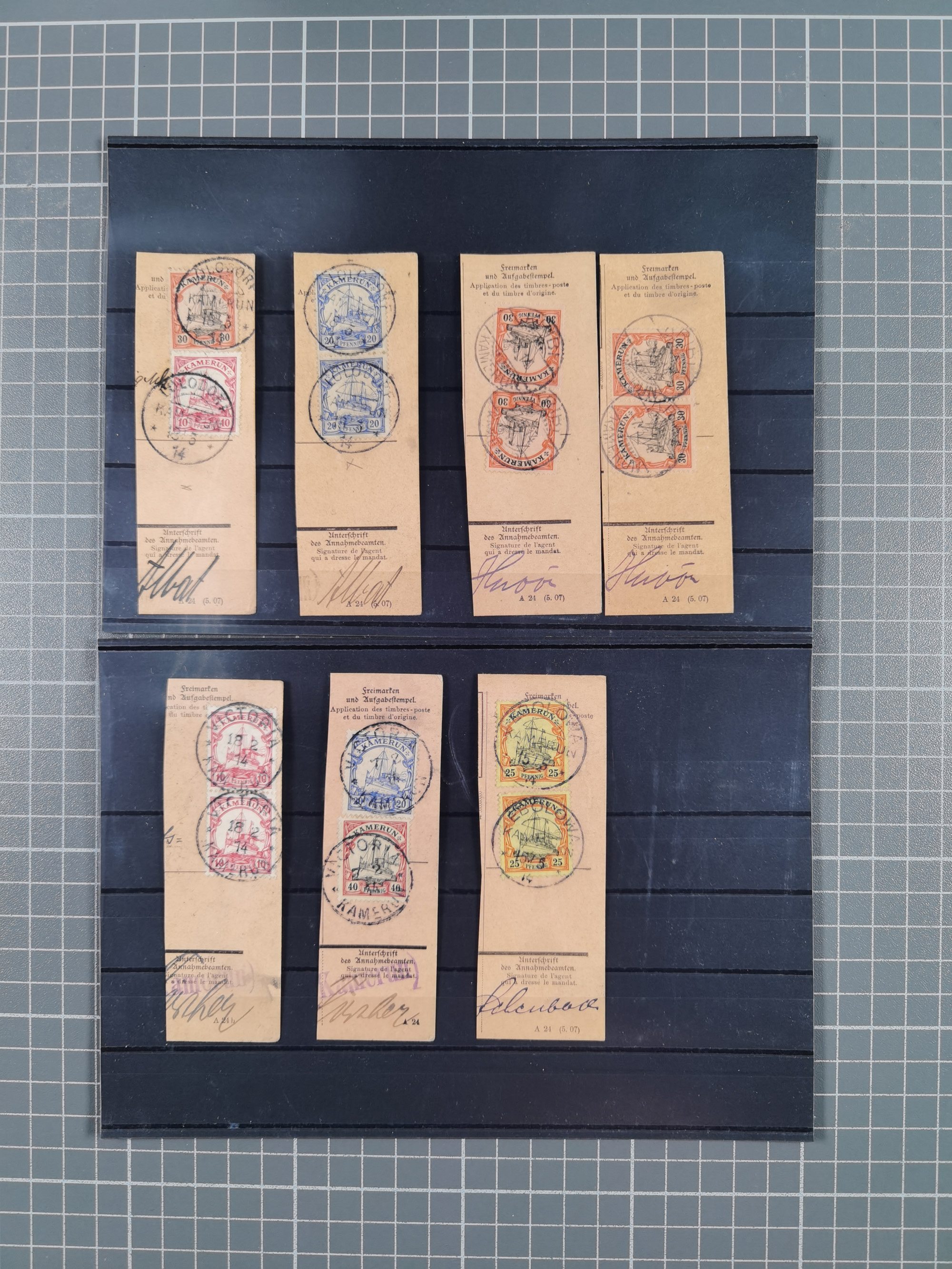 Aufdruck Samoa Mi.1PFII ungebr. gepr. Bothe, Togo frz. Bes., meist gute Erhaltung, mit einigen Briefstücken und Postkarte mit Germania 20 Pf gestempelt Ost-Asiatische Hauptlinie c 1901, teils signiert, auf Vordruckseiten.