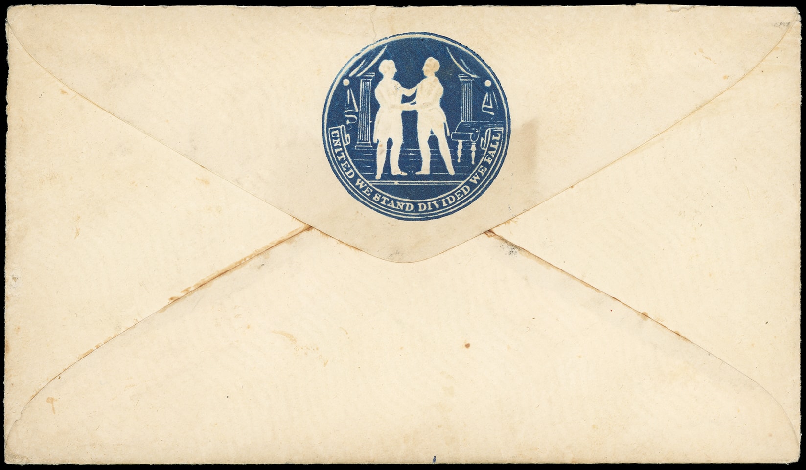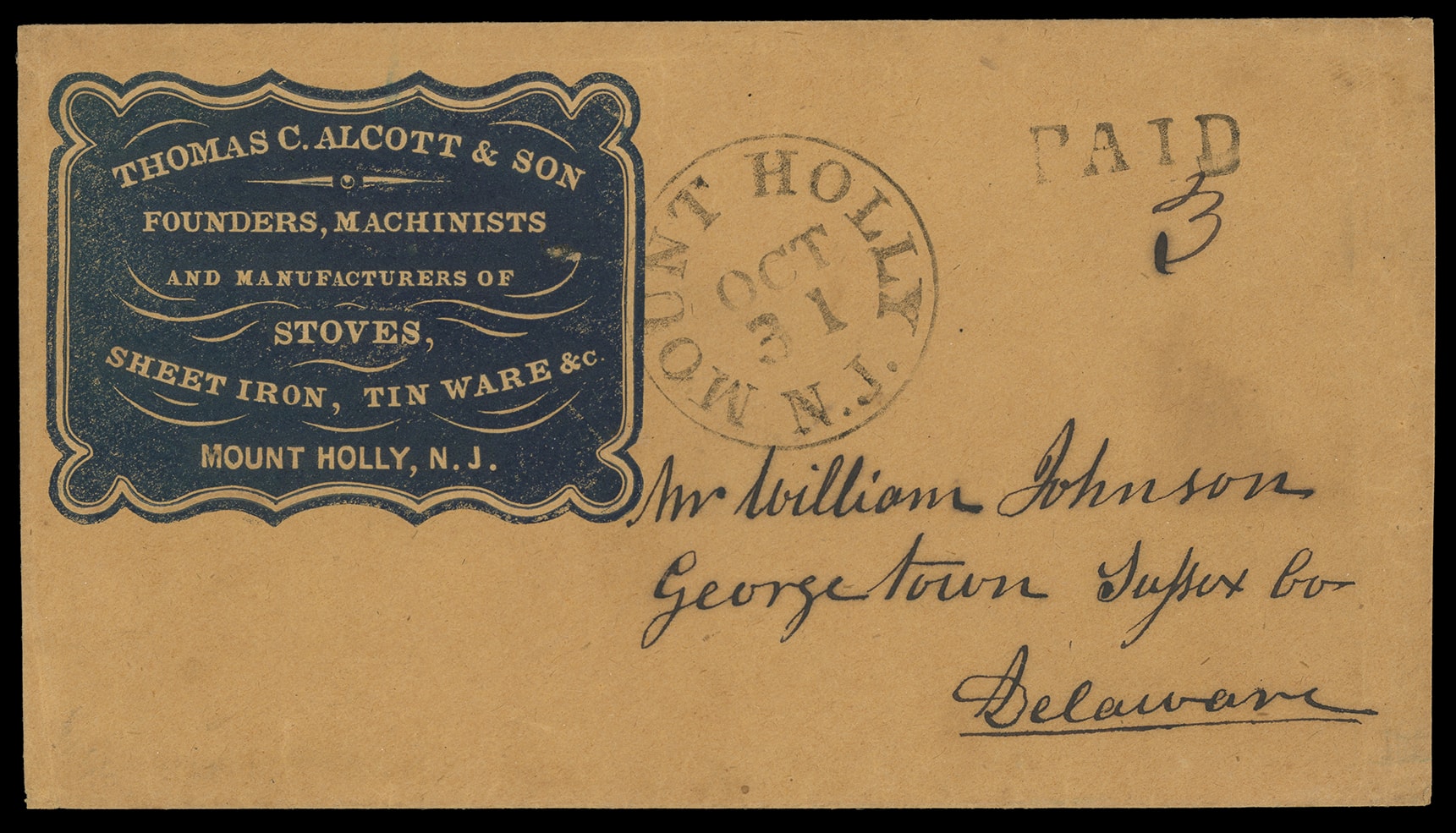 311       image(Cameo) Thomas C. Alcott & Son, Founders, Machinists and Manufacturers of Stoves, Mount Holly N.J. Embossed blue shield cameo ad on buff cover with "Mount Holly N.J. Oct 31" cds and matching "Paid" handstamp with ms. "3" rating to Georgetown Del., flap with embossed "Made in Henry Percival, Philada." imprint, Extremely Fine.