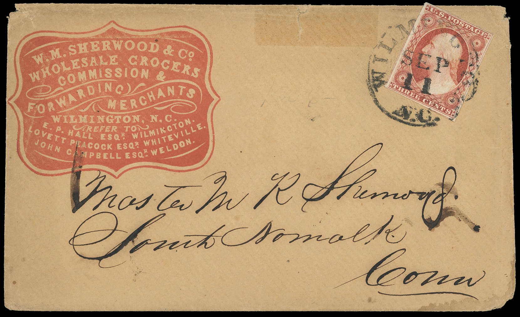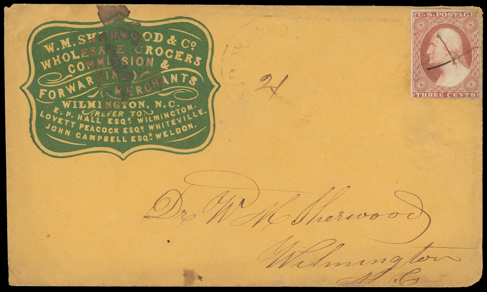 313       image(Cameo) W.M. Sherwood & co. Wholesale Grocers, Commission & Forwarding Agents, Wilmington N.C. Red and green embossed shield cameo advertising on buff covers bearing 3¢ dull red (11A), one from Wilmington N.C. and one from Stricklands Depot N.C. back to Wilmington; faults, Fine pair.
