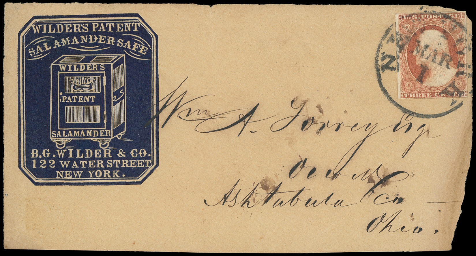 314 ()      image(Cameo) Wilder's Patent Salamander Safe, B.G. Wilder & Co., New York N.Y. Illustrated blue cameo showing Wilder's Salamander Safe on buff cover front bearing 3¢ dull red (11) tied by "New-York, Mar 1" cds to Orwell, Ohio; small edge tear and reduced slightly, Fine cameo front.