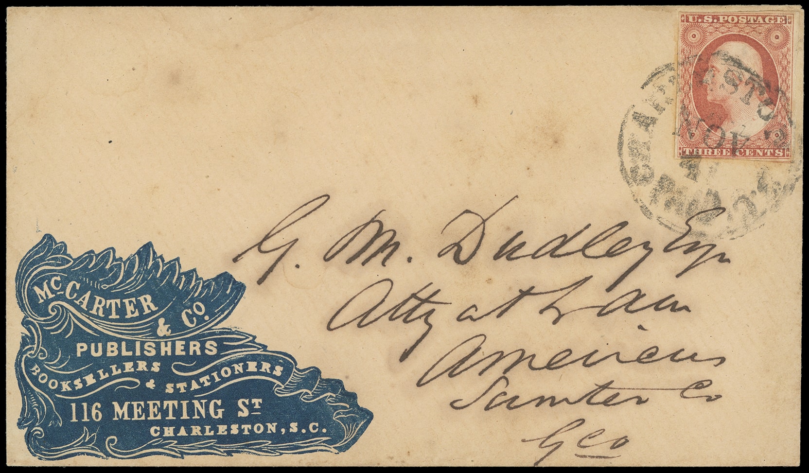 306       image(Cameo) McCarter & Co. Publishers, Charleston, S.C. Blue fancy embossed cameo corner card on light buff cover bearing 3¢ dull red (11), four margins, tied by "Charleston, S.C., Paid, Nov 4" cds to Americus Ga., Very Fine.