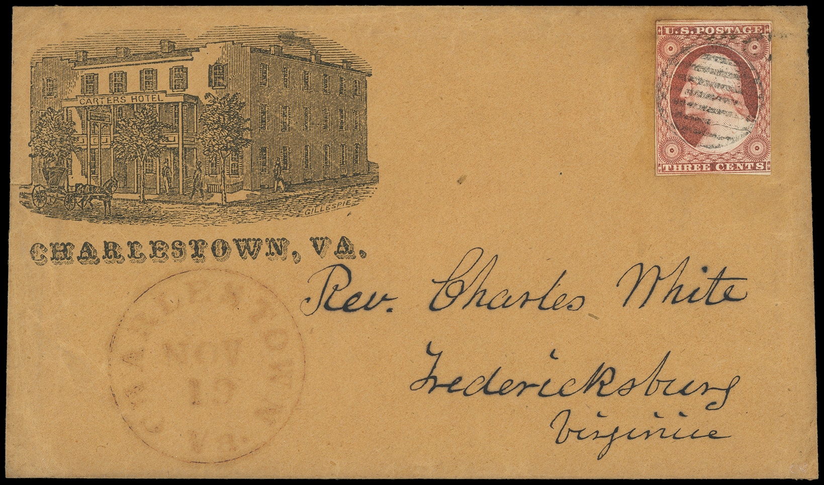 317       image(Hotels) Carters Hotel, Charlestown Va. (currently West Va.). Illustrated building woodcut ad on orange buff cover bearing 3¢ dull red (11A) canceled by circular grid cancel, red "Charlestown Va., Nov 19" cds to Fredericksburg Va., Very Fine.