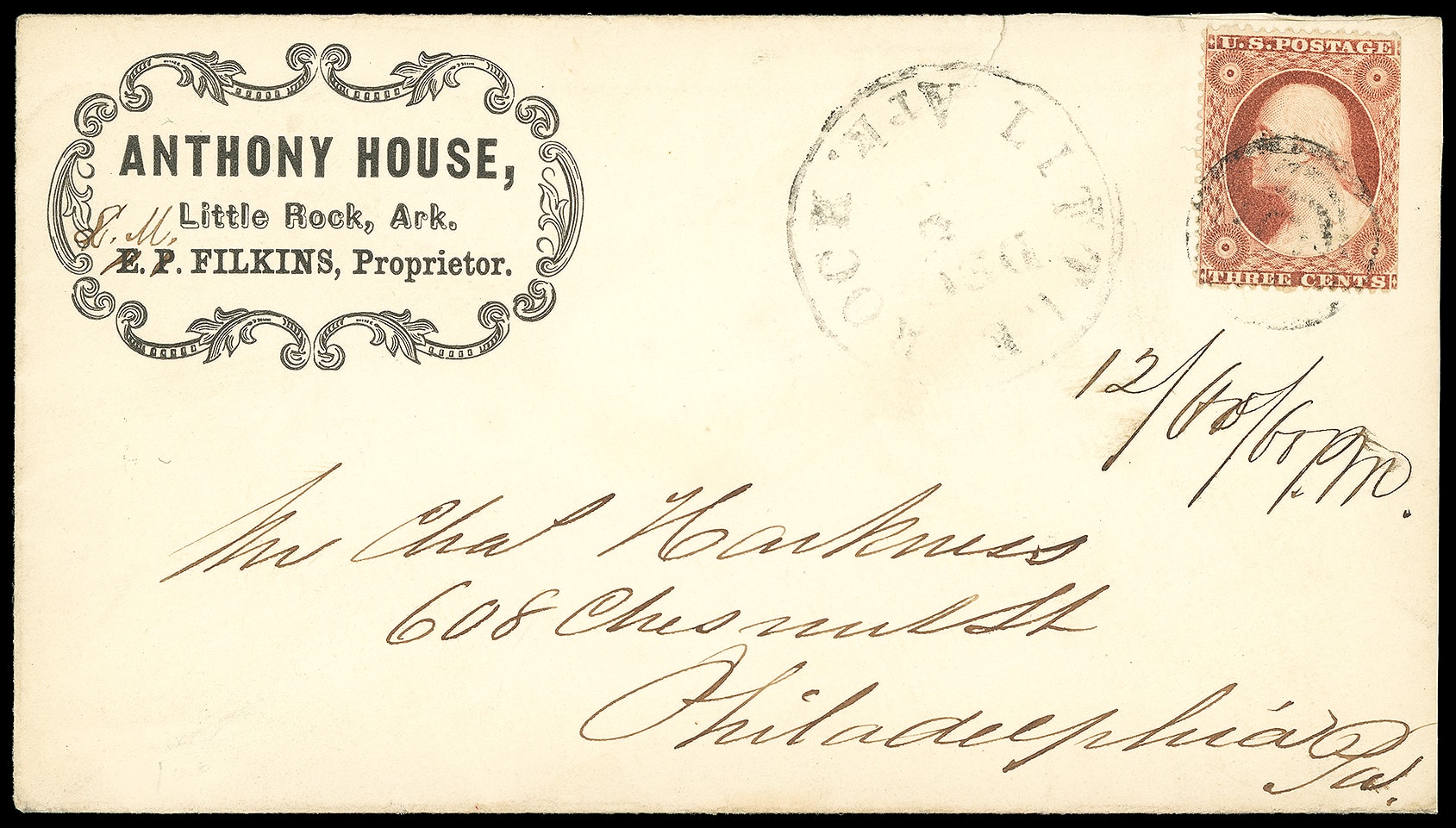 316       image(Hotels) Anthony House, Little Rock, Arkansas. Fancy framed corner card on cover bearing 3¢ dull red (26), tied by four-ring target, duplexed with "Little Rock, Ark. Dec 8" cds to Philadelphia Pa., Dec. 10th 1860 receipt docketing; tiny edge tear, Very Fine.