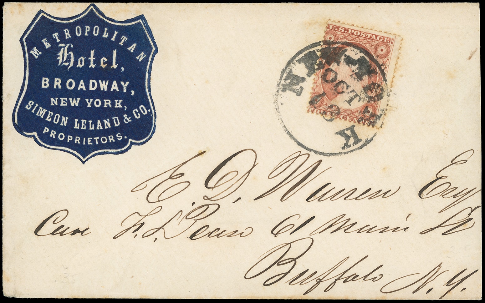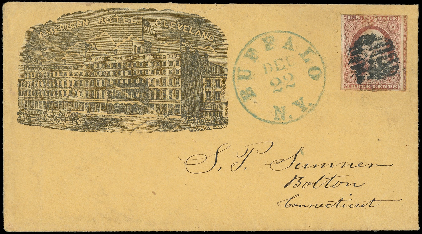 315       image(Hotels) American Hotel, Cleveland Ohio. Beautiful woodcut building corner card showing waving American flags and horse-drawn coaches, on orange cover bearing 3¢ dull red (11A), wide margins, canceled by circular grid, neat blue "Buffalo N.Y., Dec 22" cds to Bolton Ct.; small top edge mend, otherwise Very Fine.