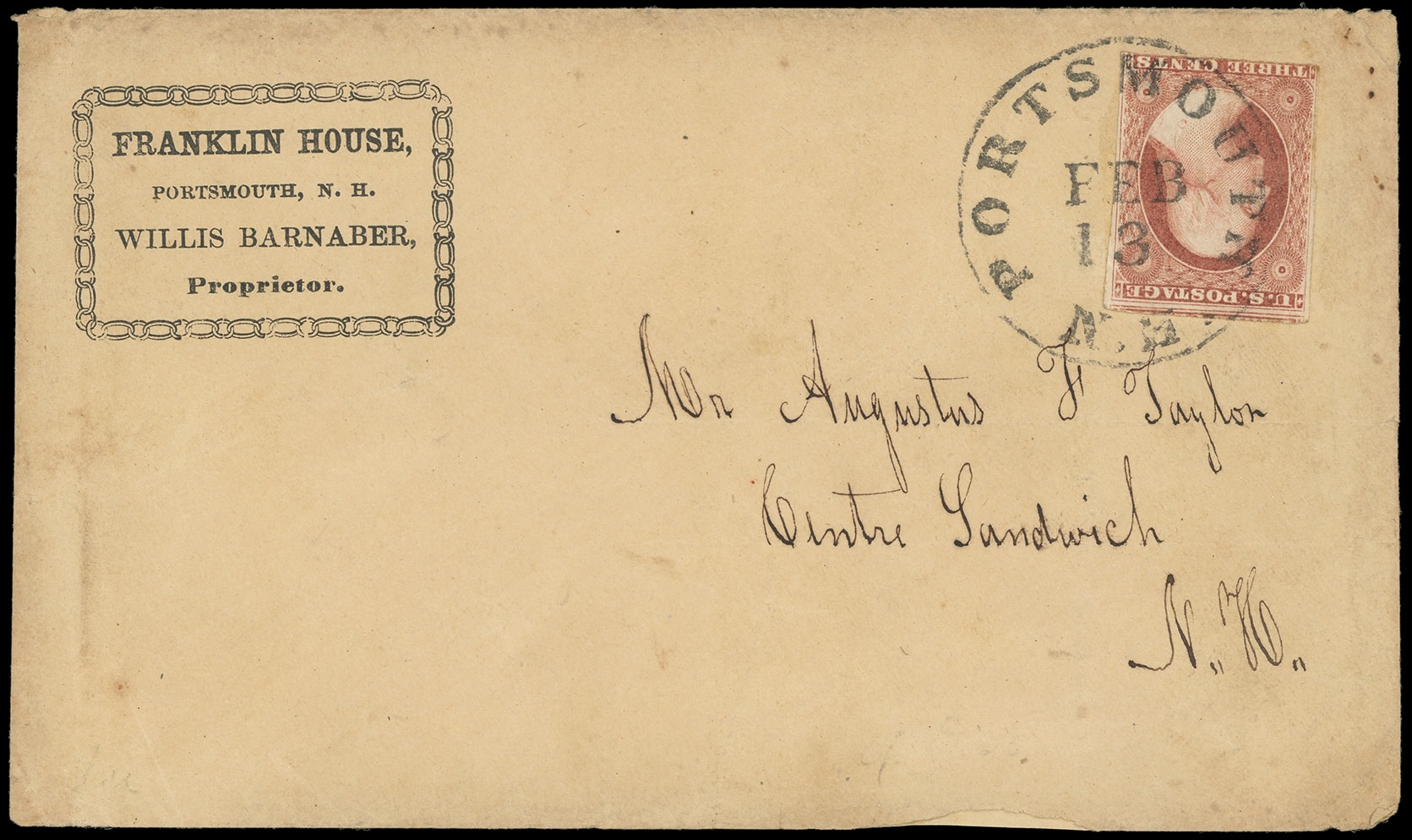 320       image(Hotels) Franklin House, Portsmouth N.H. Francy framed corner card on buff cover bearing 3¢ dull red (11), three large margins, tied by "Portsmouth N.h., Feb 13" cds to Centre Sandwich N.H.; some wear with small bottom edge mend, F.-V.F.