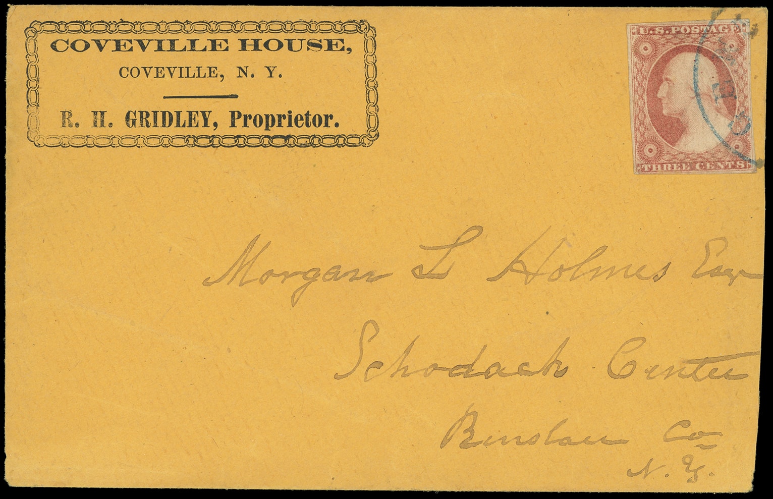 319       image(Hotels) Coveville House, Coveville N.Y. Fancy framed corner card on orange cover bearing 3¢ dull red, three lines recut upper left triangle (11A var.), four margins, tied by partial blue Coveville N.Y. cds to Schodach Center N.Y.; reduced at right, F.-V.F.
