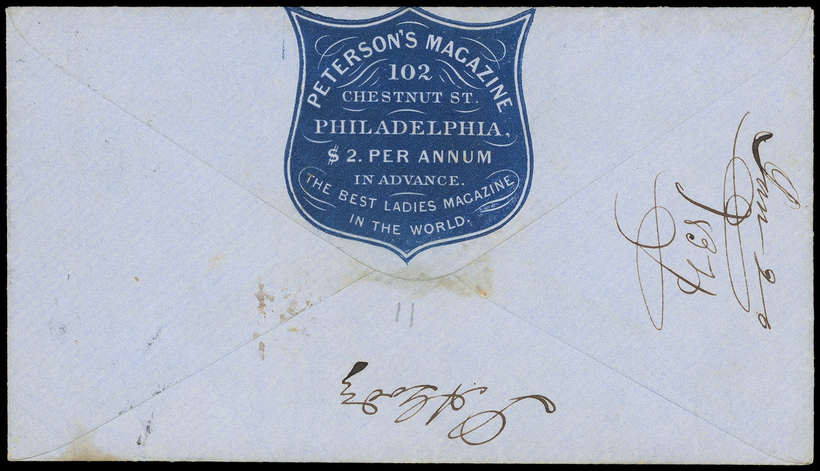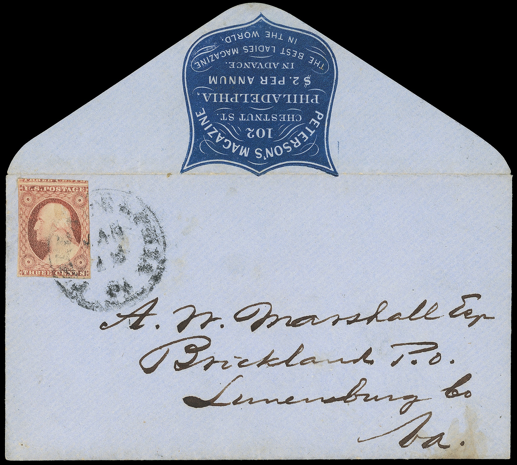 308       image(Cameo) Peterson's Magazine, Philadelphia Pa. Blue shield flap cameo stating "The Best Ladies Magazine in the World" on blue cover bearing 3¢ dull red (11A) tied by blurry "Philadelphia Pa., Jan 12" cds to Brickland Va., 1854 original enclosed letter concerning duplicate subscription orders; faint tone spot lower right, Very Fine.