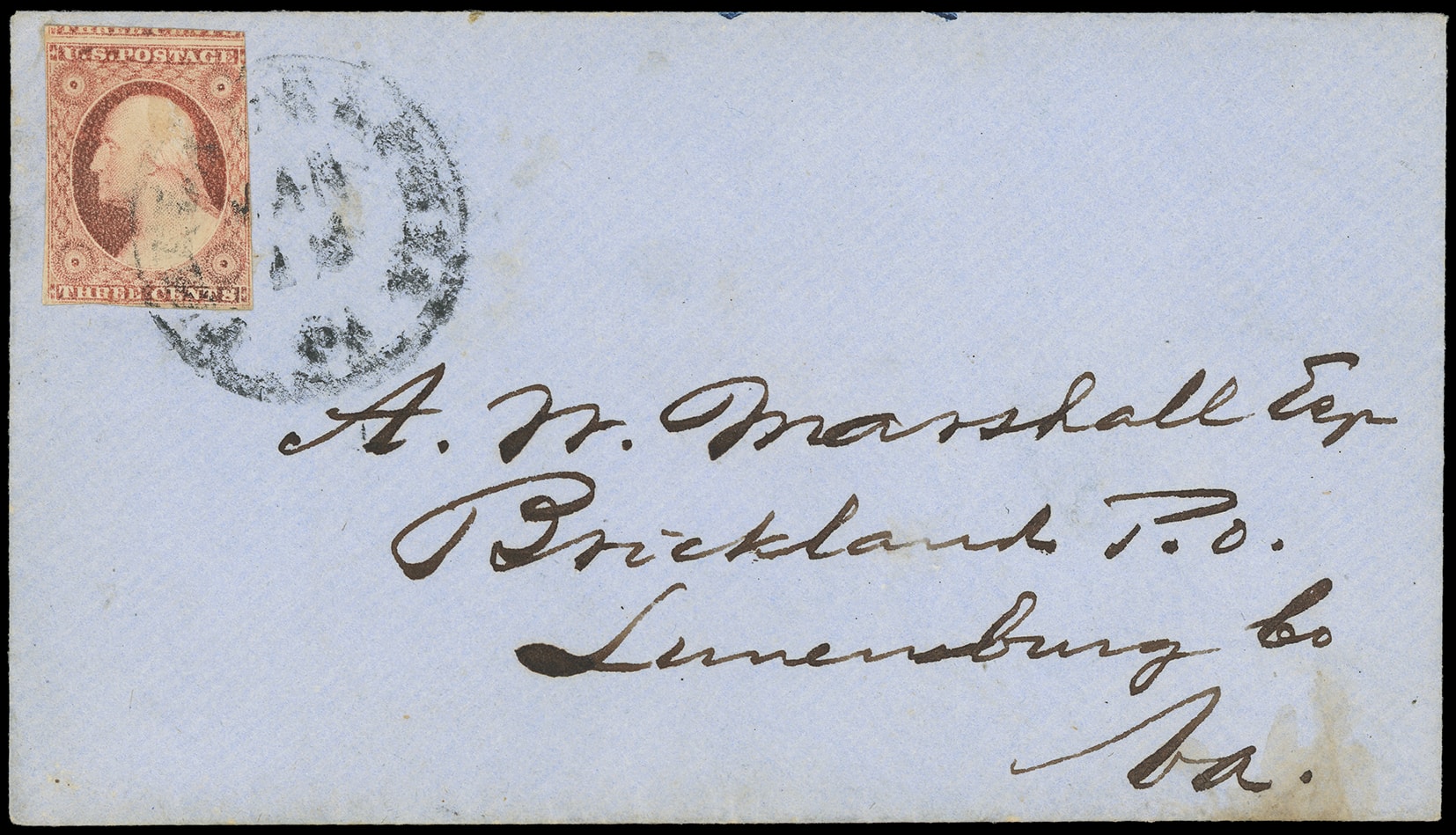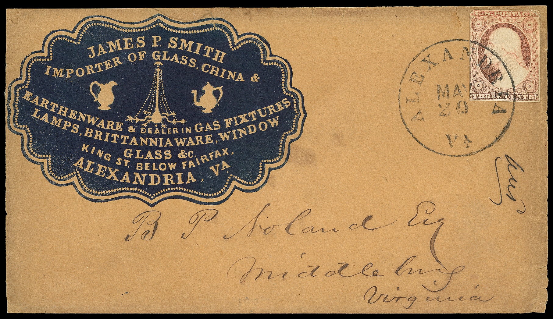 301       image(Cameo) James P. Smith, Importer of Glass, China & Earthenware, Alexandria Va. Blue large illustrated cameo corner card showing pitcher and tea pot on orange buff cover bearing 3¢ dull red (11A), corner flaw, tied by sharp "Alexandria Va. May 20" cds to Middleburg Va.; couple top edge tears, otherwise Very Fine and beautiful cameo.