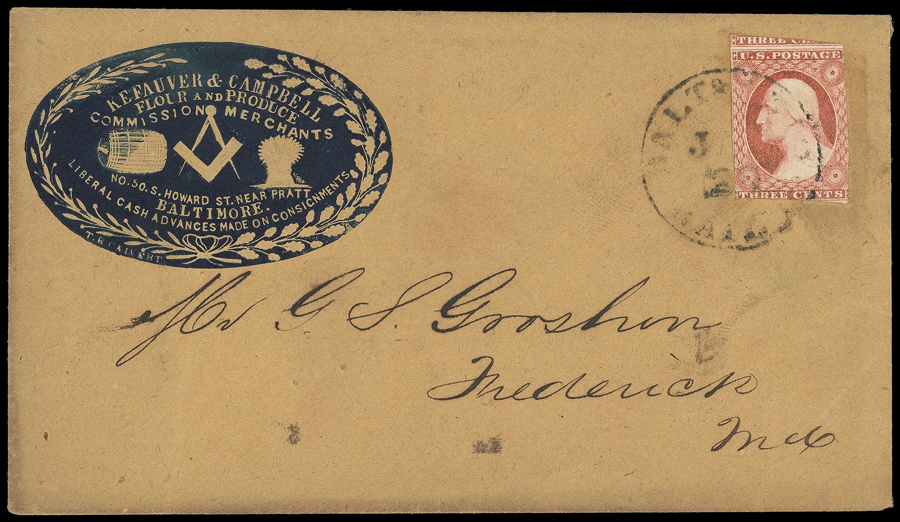 302       image(Cameo) Kefauver & Campbell, Flour & Produce Commission Merchants, Baltimore Md. Blue fancy illustrated embossed corner card showing Masonic Symbol & Barrel & Sheaf of Wheat on buff cover bearing 3¢ dull red (11A), margins to in, tied by partial "Balt & Ohio, Rail Rd. Mar 4" railroad route agent cds to Frederick, Md.; flap torn, Very Fine.