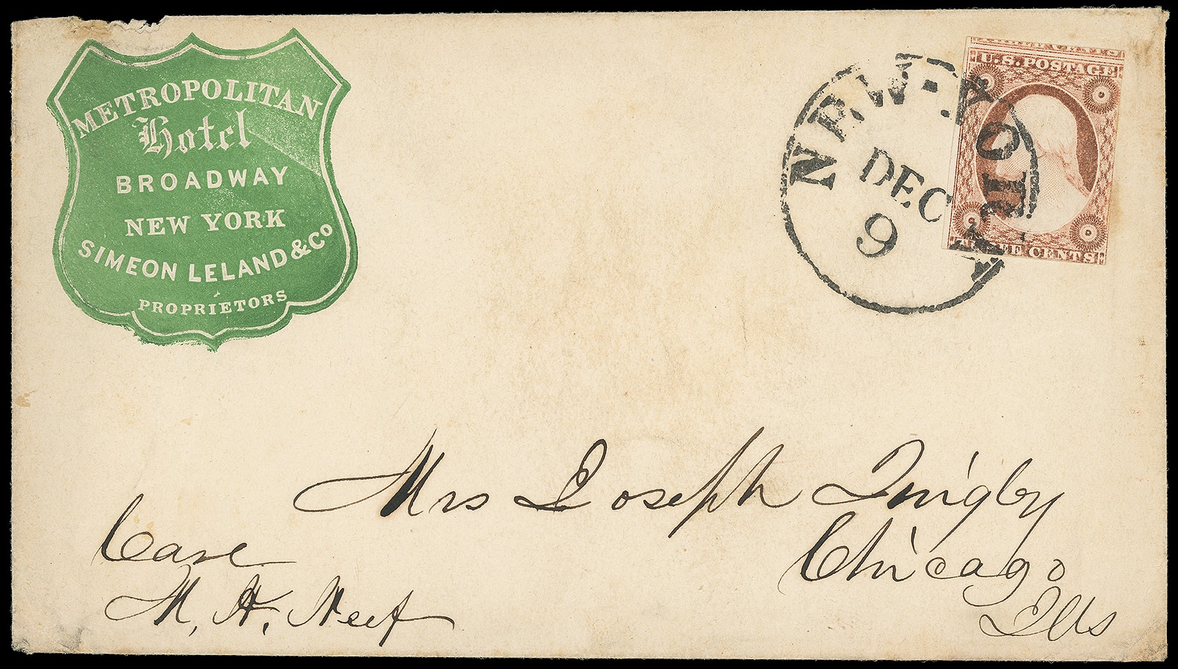 307       image(Cameo) Metropolitan Hotel, New York City. Matching green, red and blue shield cameos on covers bearing 3¢ dull red (11A) or 3¢ dull red (26) frankings tied by New York cds strikes; faults, Fine and scarce trio.
