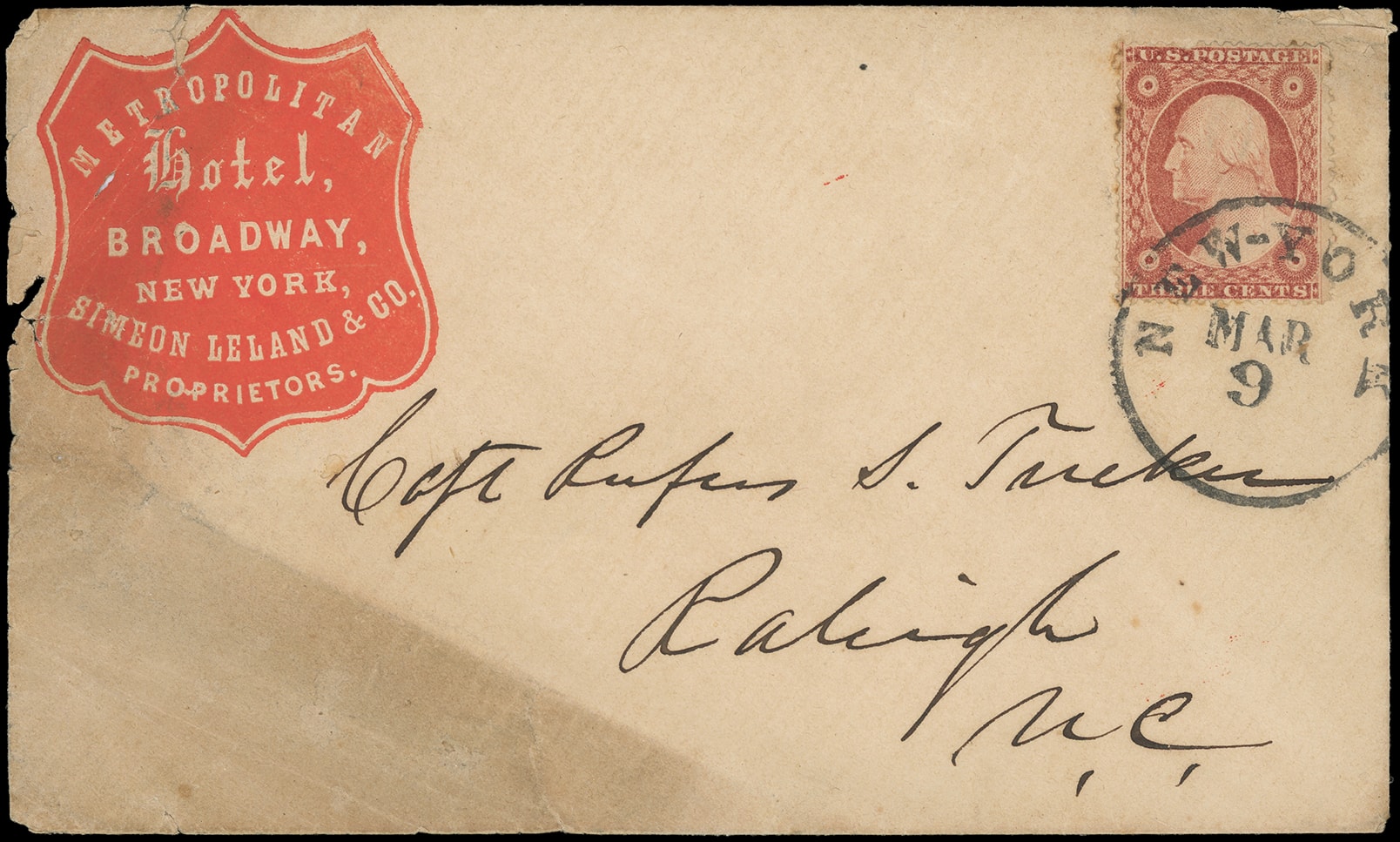305       image(Cameo) Lovejoy's Hotel, New York City. Embossed blue cameo design showing building on buff cover bearing 3¢ dull red (11A), large margins to clear, tied by "New-York, Mar 10" cds to Salem Ct.; large cover tear, Fine appearance.