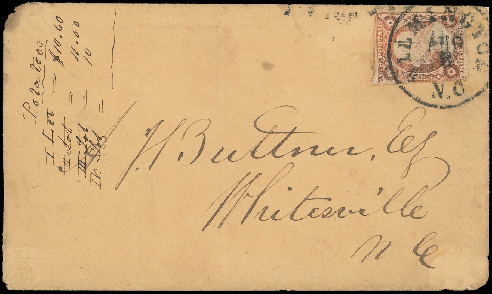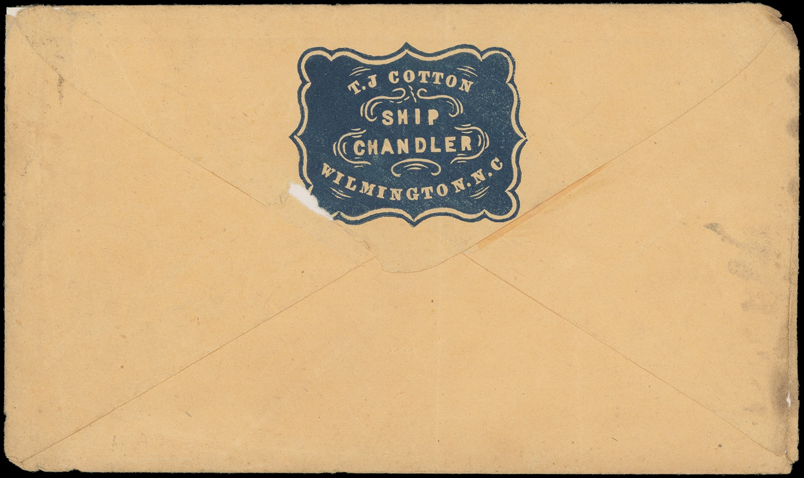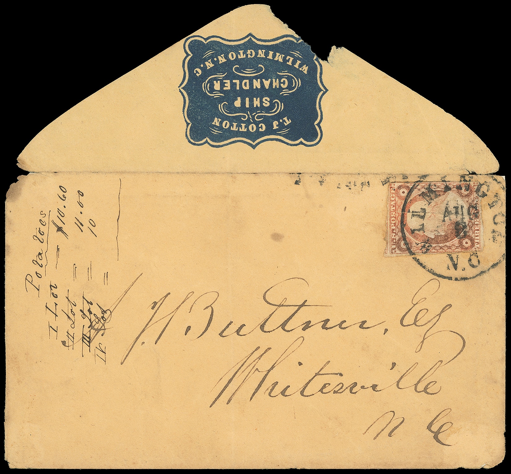 310       image(Cameo) T.J. Cotton, Ship Chandler, Wilmington N.C. Blue embossed flap cameo on buff cover bearing 3¢ dull red (11A), margins to in, tied by "Wilmington N.C. Aug 8" cds to Whitesville N.c.; bit of flap missing just affecting cameo, some tallying notes on face, Fine.
