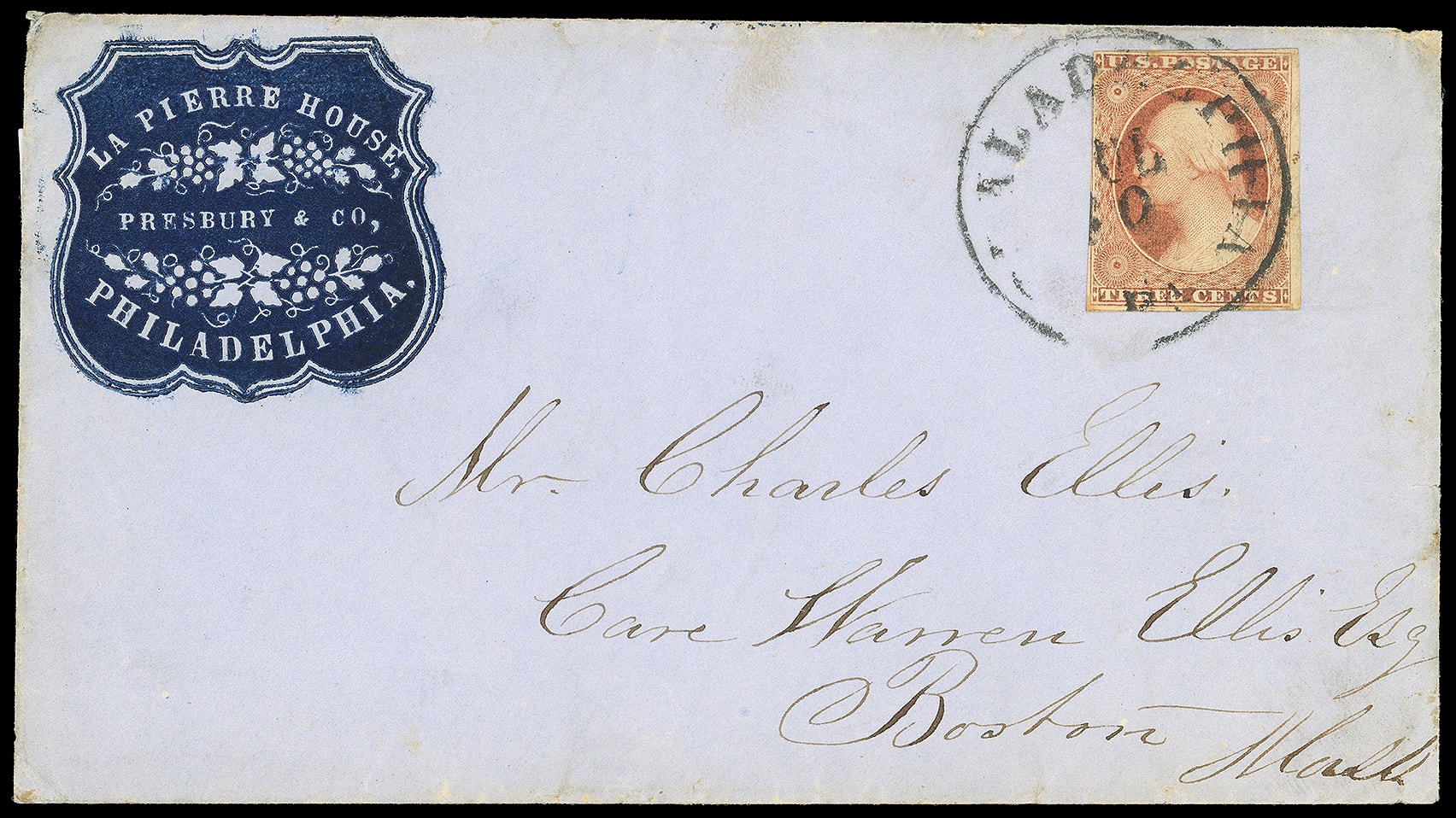 304       image(Cameo) La Pierre House, Presbury & Co., Philadelphia Pa. Embossed blue shield cameo corner card showing floral design on cover bearing 3¢ dull red (11), large margins to touched, tied by "Philadelphia Pa., Jul 30" cds to Boston Mass.; some edge wear, F.-V.F.