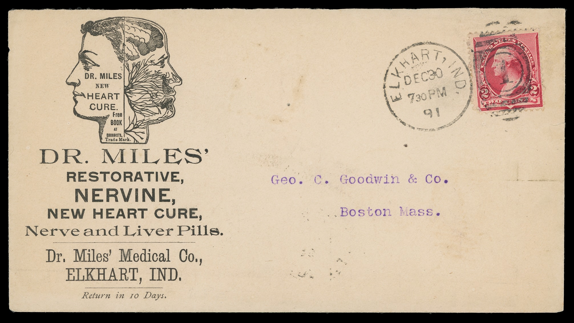 Miles' Restorative Nervine, Dr. Miles' Medical Co., Elkhart Ind. Illustrated "New Heart Cure, Nerve and Liver Pills" ad with overall text listing of successful sales on reverse of cover bearing 2¢ carmine (220) tied by "Elkhart, Ind. Dec