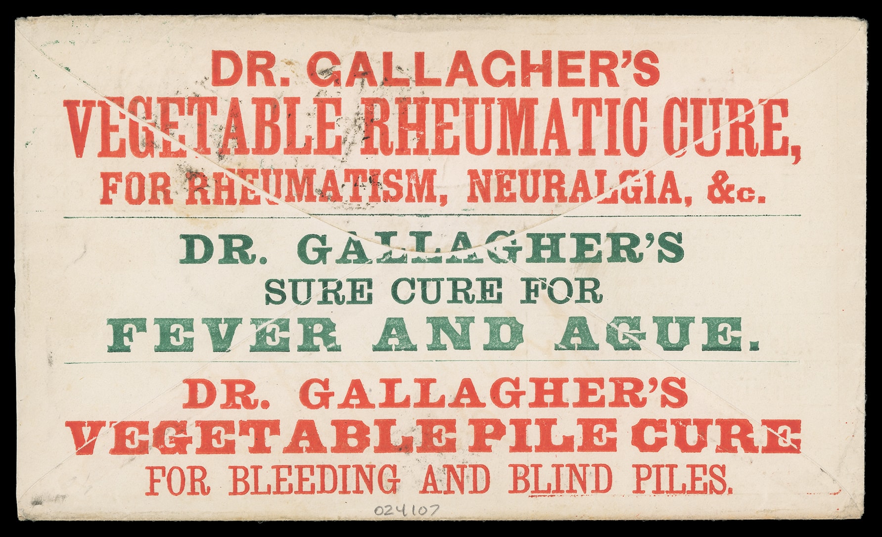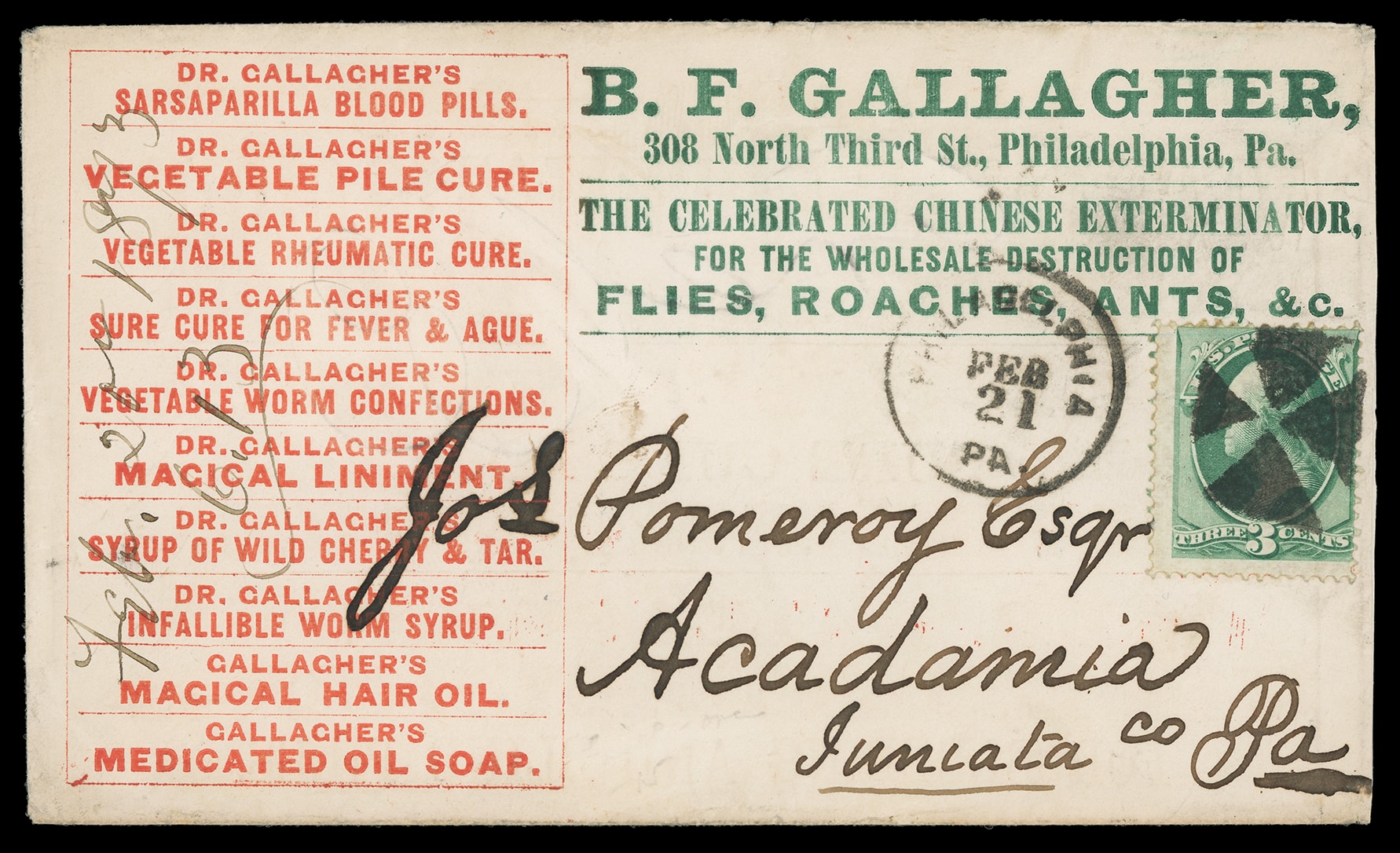 Gallagher's Sarsaparilla Blood Pills, B.F. Gallagher, Philadelphia Pa. Red and green text ad design with various quack medicines on front and reverse of cover bearing 3¢ green (147) tied by cross cancel duplexed with "Philadelphia