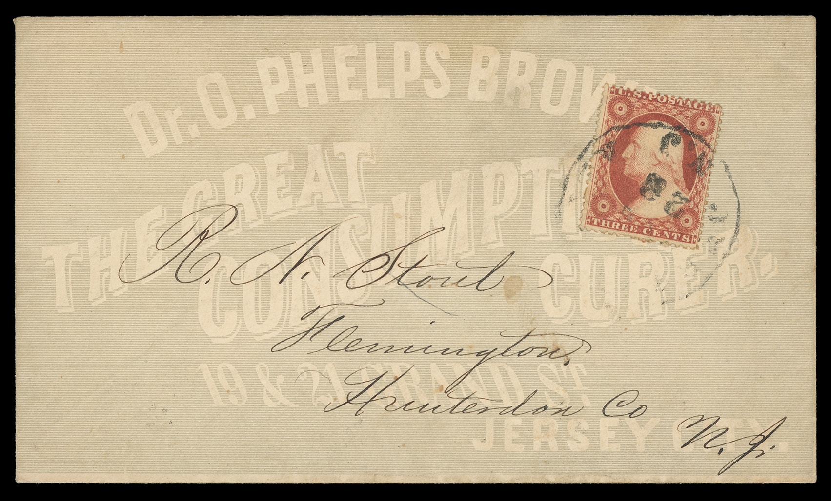 Phelps Brown, The Great Consumption Curer, Jersey City N.J. Overall shaded ad cover bearing 3¢ dull red (26) tied by partial "Jersey city N.J." cds to Flemington N.J., Very Fine. Estimate; $100 - 150. (Image1)