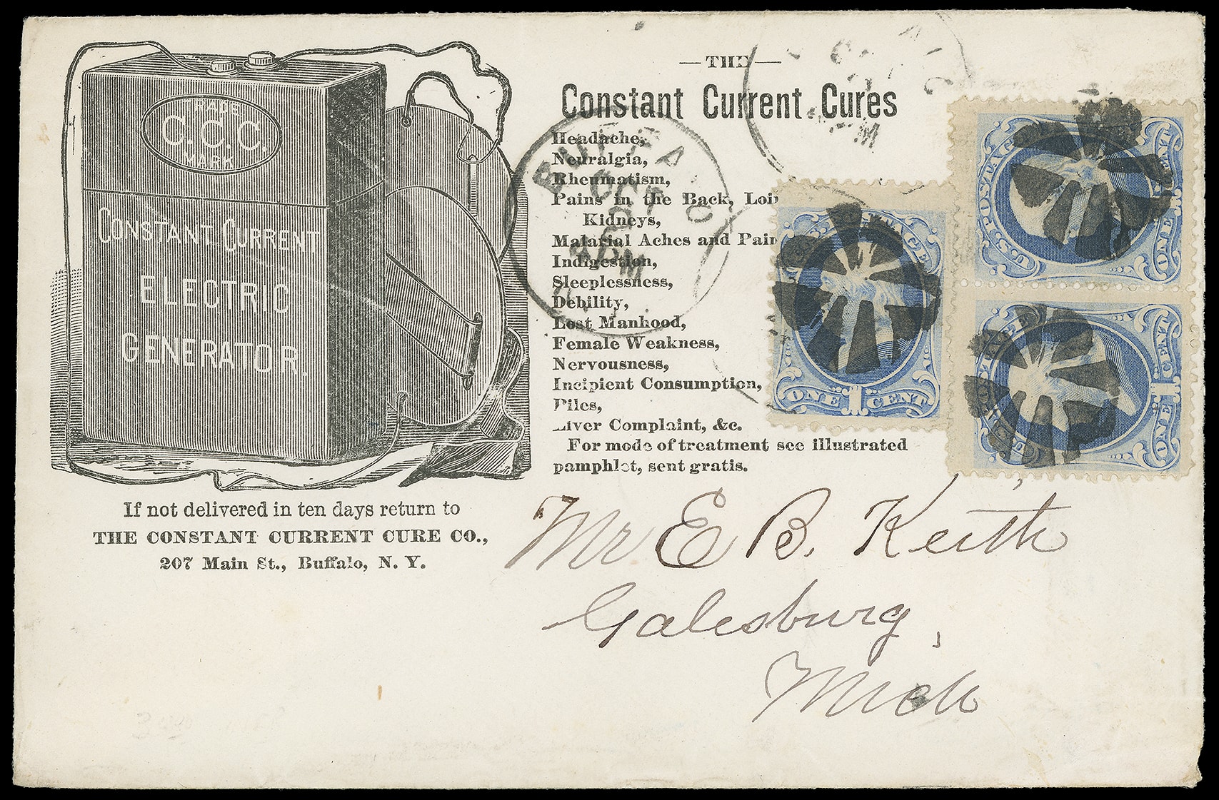 Current Electric Generator, The Constant Current Cure Co., Buffalo N.Y. Illustrated advertising design showing generator on cover bearing three 1¢ blue (182) singles, tied by circular of wedges cork cancels duplexed with "Buffalo
