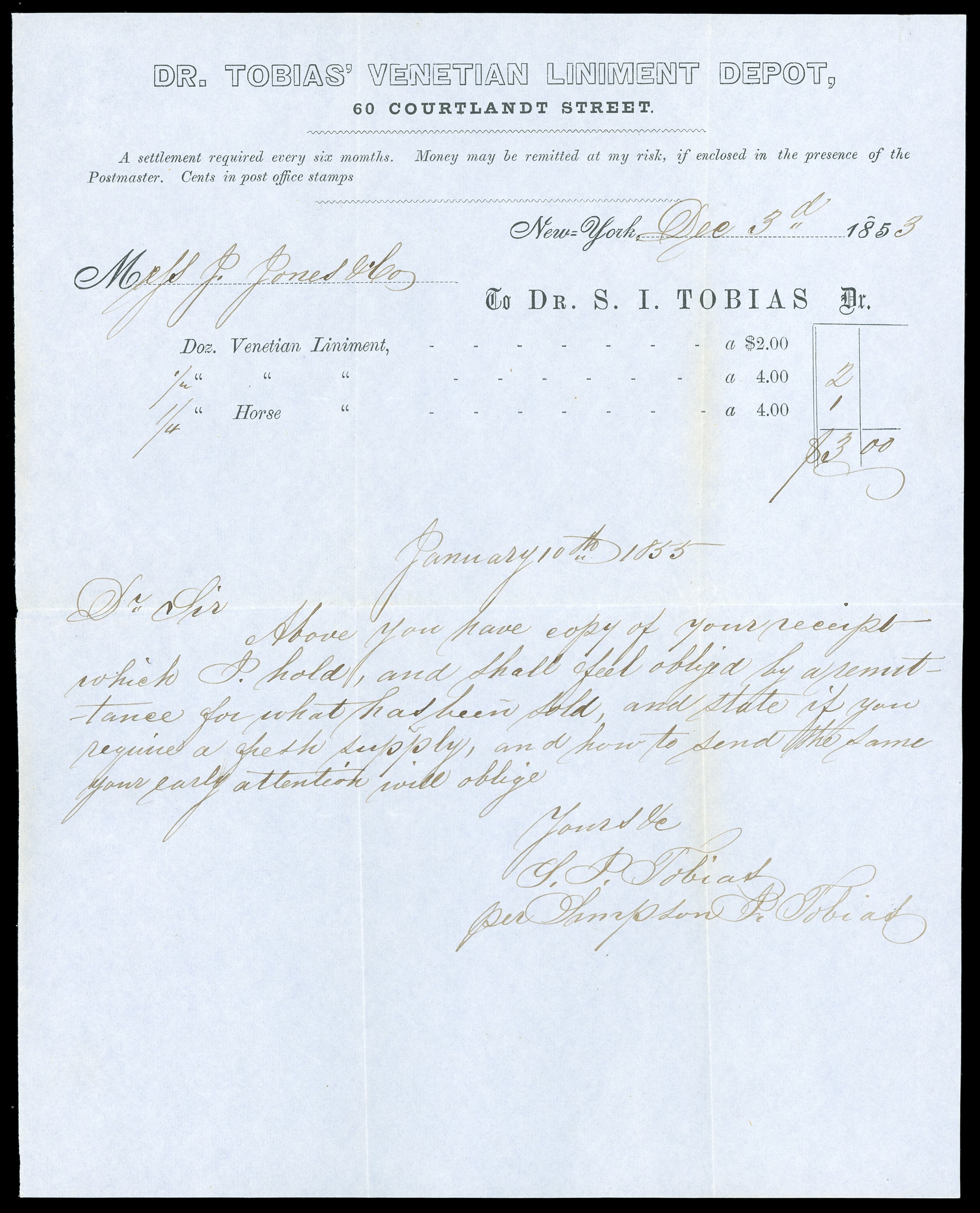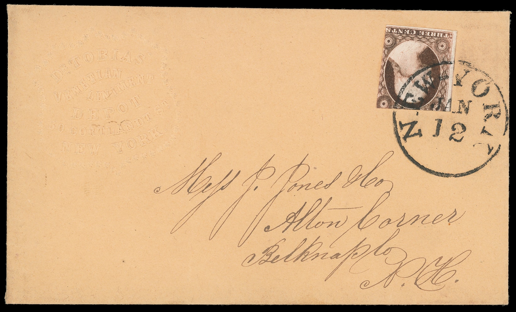 Tobias' Venetian Liniment, New York N.Y. Blind embossed "shield" type advertising corner card on buff cover bearing 3¢ dull red (11A), unusually trimmed, tied by "New-York, Jan 12" cds to Alton Corner N.H., with printed "Dr Tobias'