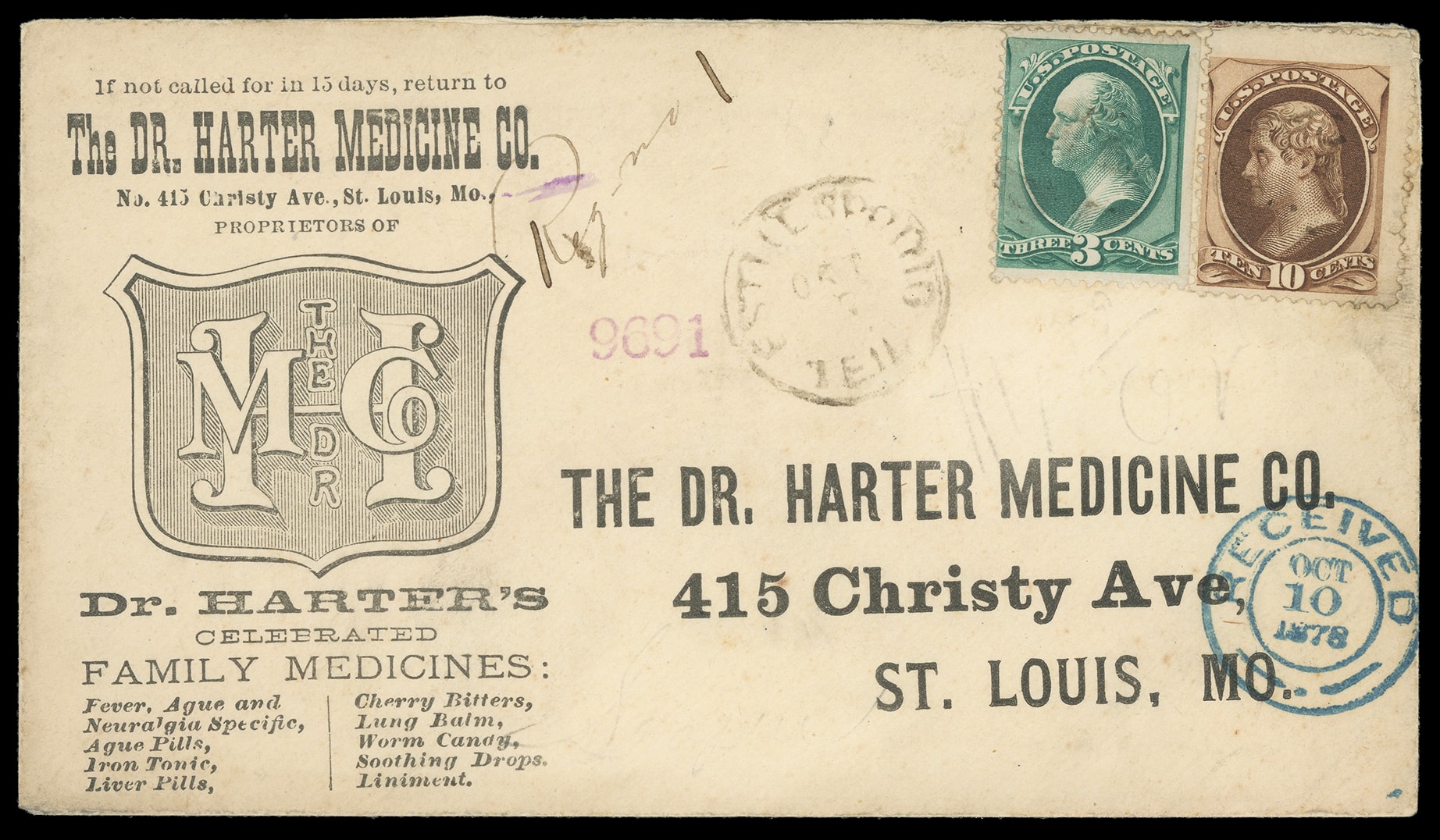to St. Louis Mo., manuscript "Reg 1" and violet "9691" handstamp, blue St Louis "Received, Oct 10, 1878" cds; light soiling, 10¢ small tear, F.-V.F. and scarce Dr. Harter ad design. Estimate; $75 - 100. (Image1)
