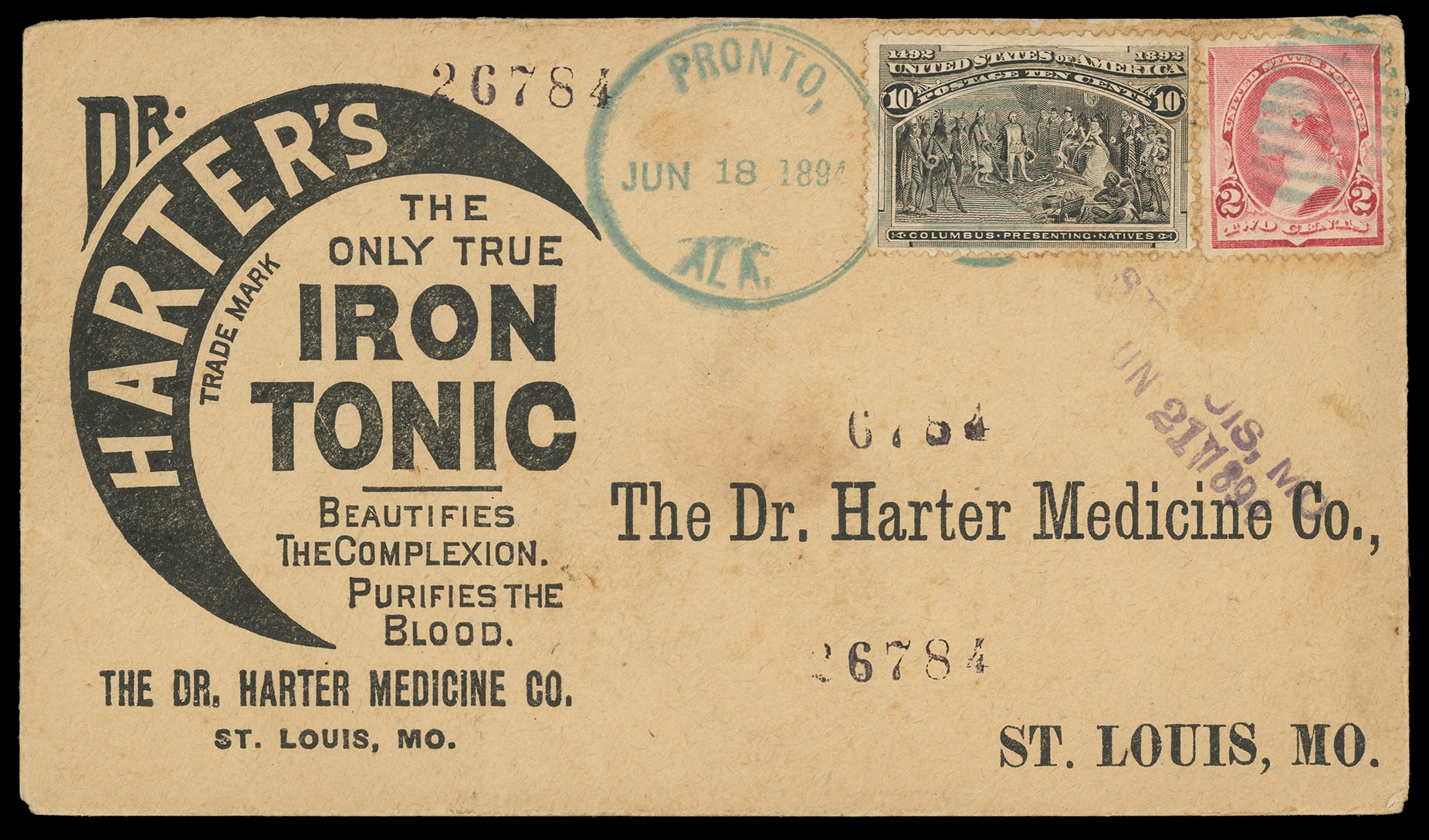 True Iron Tonic, Dr. Harter Medicine Co., St. Louis Mo. Illustrated advertising with additional advertising on reverse on buff return registered cover bearing 2¢ carnine (220) and 10¢ Columbian (237), both tied by blue "Pronto, Ala.