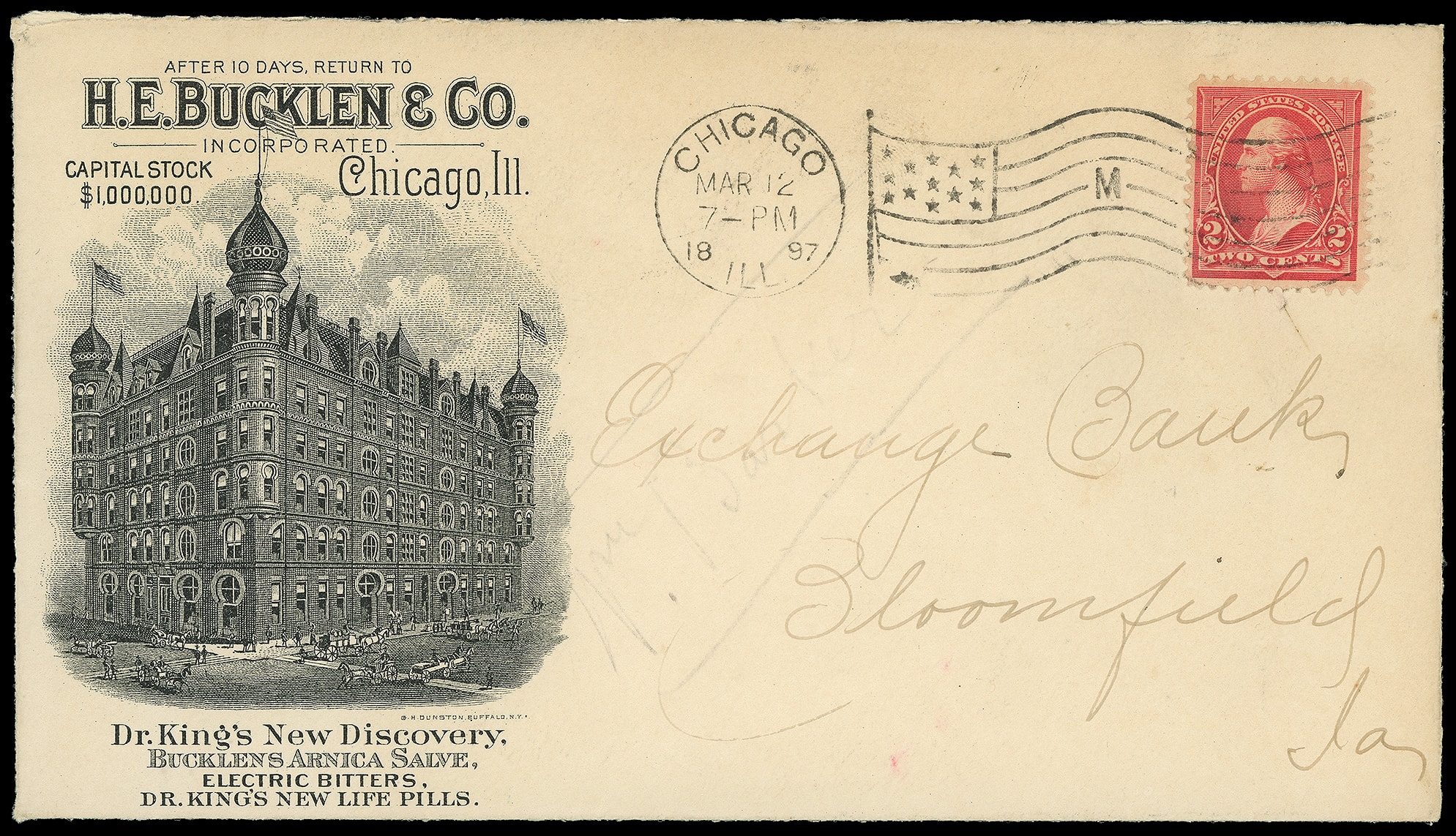 New Life Pills, H.E. Bucklen & Co., Chicago Ill. Illustrated building advertising with additional six illustrated room panels on reverse on cover bearing 2¢ carmine (267) tied by "Chicago, Ill. Mar 12, 1897" machine cancel to Bloomfield,