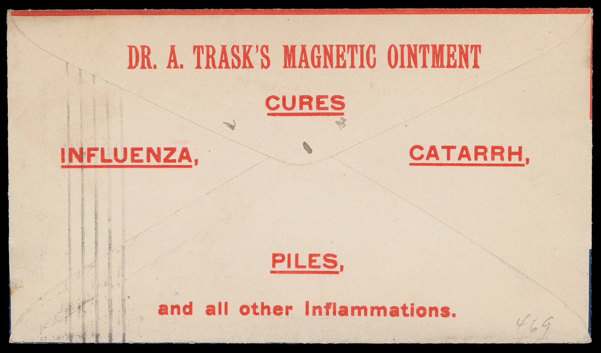 Influenza, Catarrh, Piles, Dr. A. Trask Magnetic Ointment. Red advertising on reverse, front with red and blue Spanish American War patriotic bands on unsealed cover bearing 1¢ green (279) tied by "Buffalo, N.Y. 1899" machine cancel