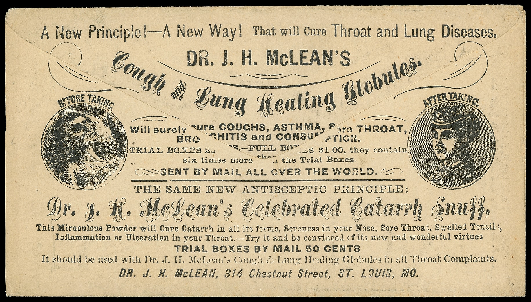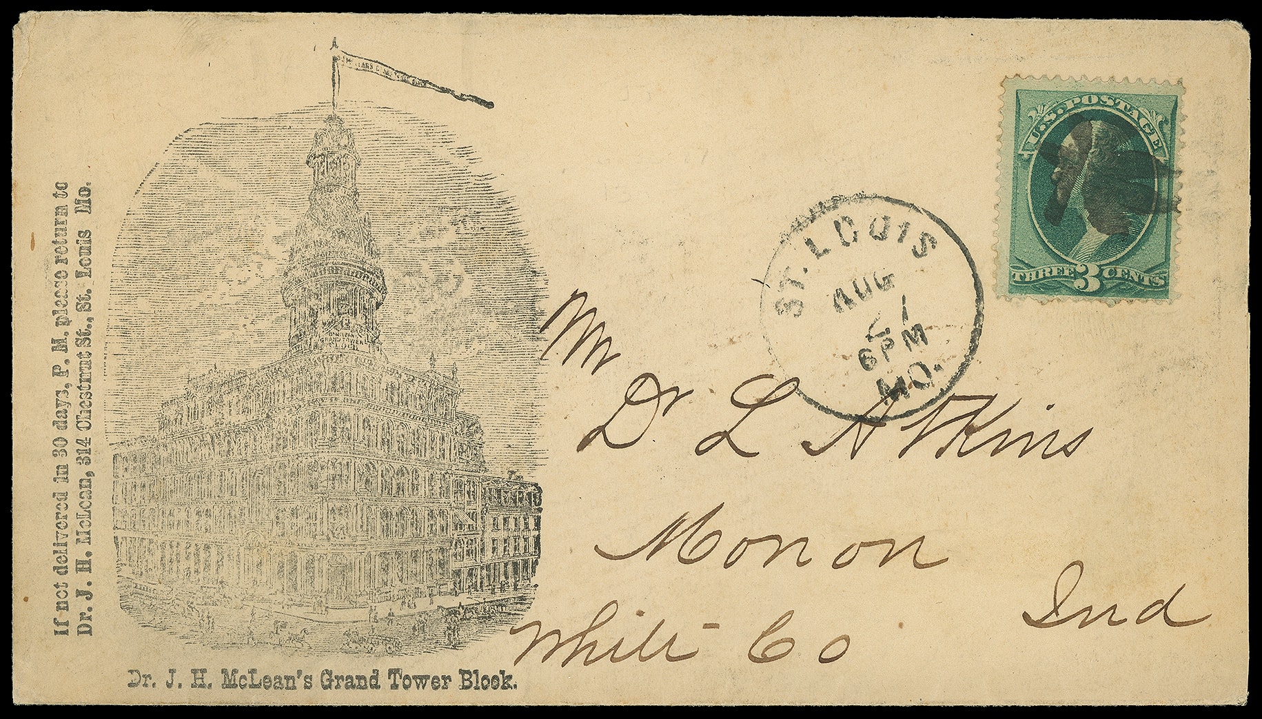 Mclean's Grand Tower Block, St. Louis, Mo. Illustrated building advertising on front and reverse with medical results before and after treatment on cover bearing 3¢ green (184) canceled by cork duplexed with "St. Louis, Mo. Aug 27" cds to