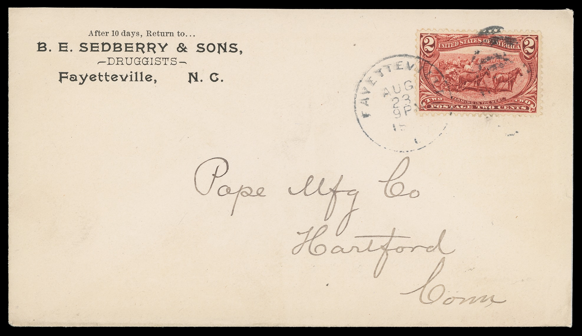 Harter's Old Reliable Family Medicines. Overall advertising on reverse of immaculate cover with printed corner card for "B.E. Sedberry & Sons, Fayetteville, N.C." bearing 2¢ Trans-Mississippi (286) tied by "Fayetteville N.C. Aug 23,