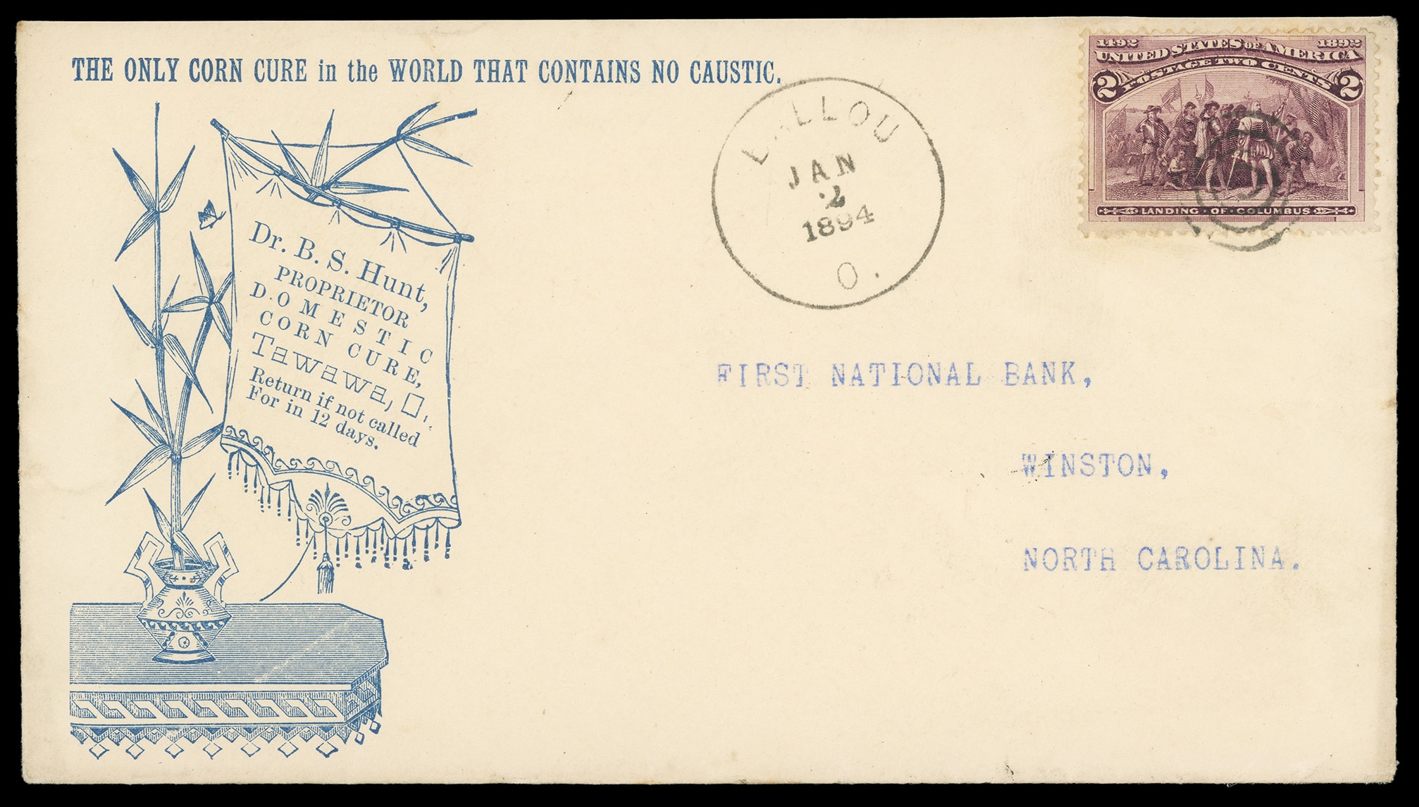 Corn Cure, Dr B.S. Hunt, Tawawa Ohio. Very attractive blue illustrated advertising on cover bearing 2¢ Columbian (231) tied by target cancel, matching "Ballou, O. Jan 2 1894" cds to Winston, N.C., Extremely Fine. Estimate;