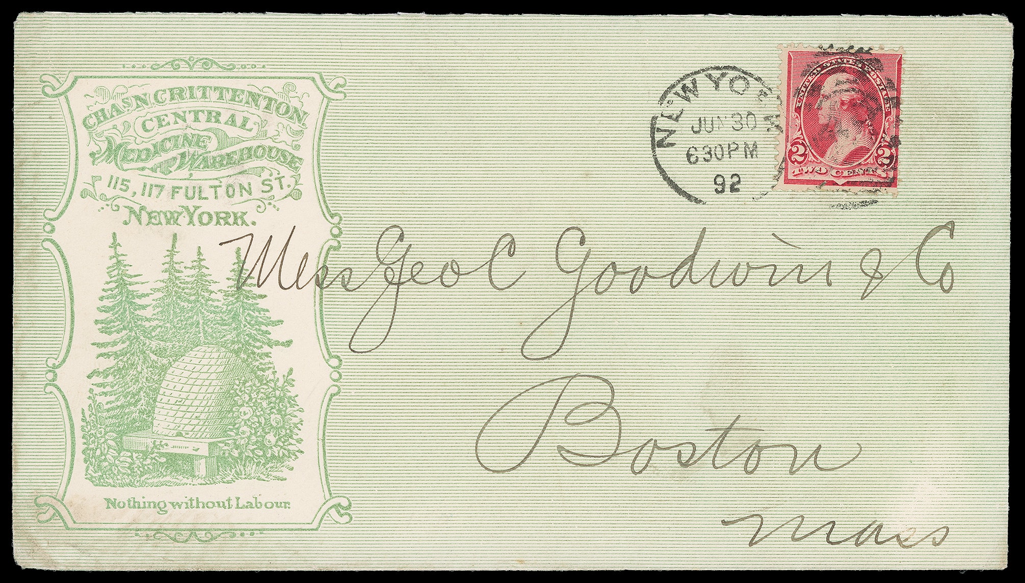 Crittenton Medicine Warehouse, New York N.Y. Overall green illustrated advertising design showing beehive on 1892 cover bearing 2¢ carmine (220) tied by "New York, Jun 30 '92" duplex to Boston, Mass, Very Fine to Extremely