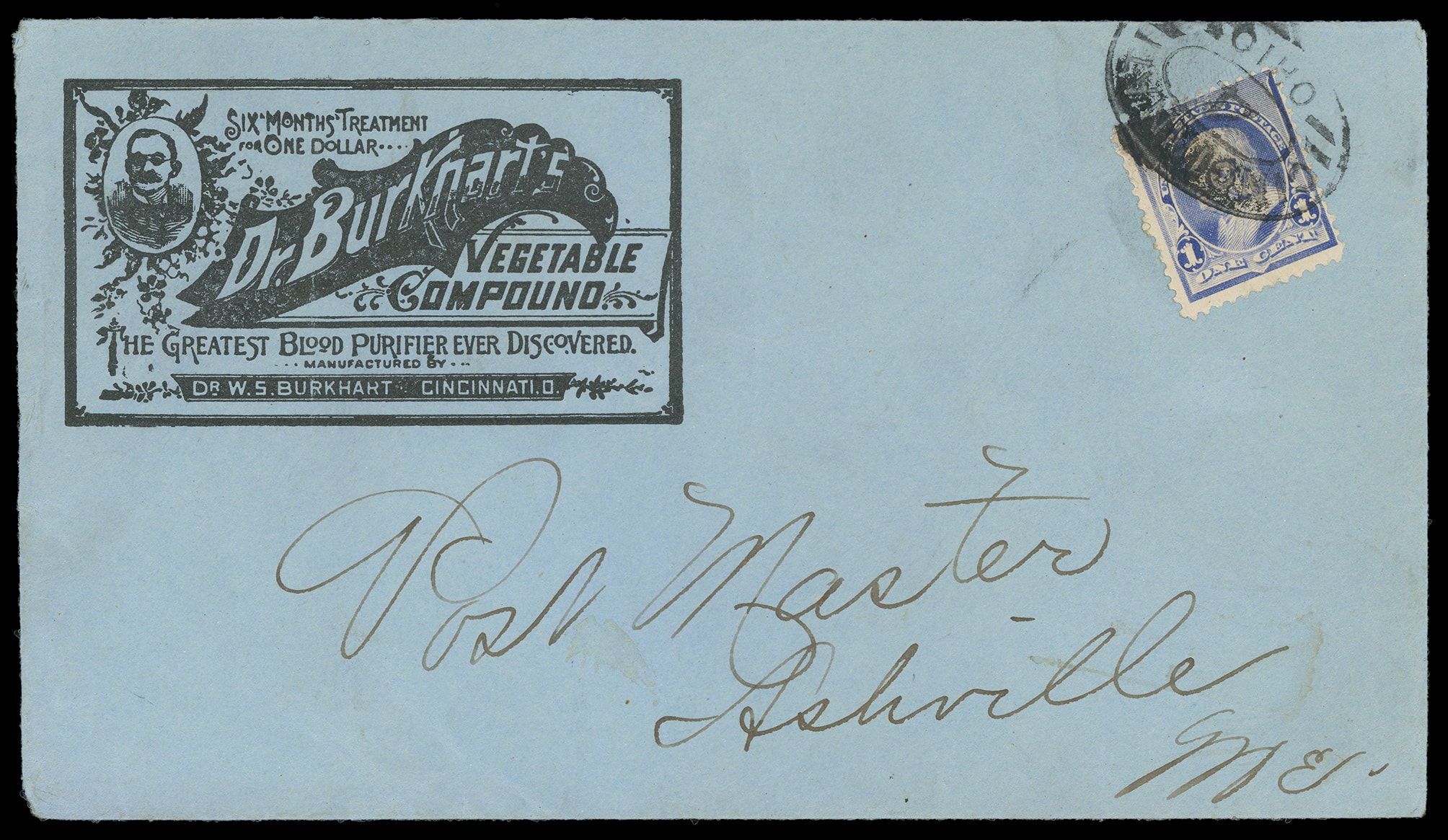 Burkhart's Vegetable Compound, Dr. W.S. Burkhart, Cincinnati O. Illustrated corner card showing Dr. Burkart on blue cover bearing 1¢ dull blue (219) tied by "Cincinnati, Ohio" double oval handstamp to Ashville Me., Very Fine and