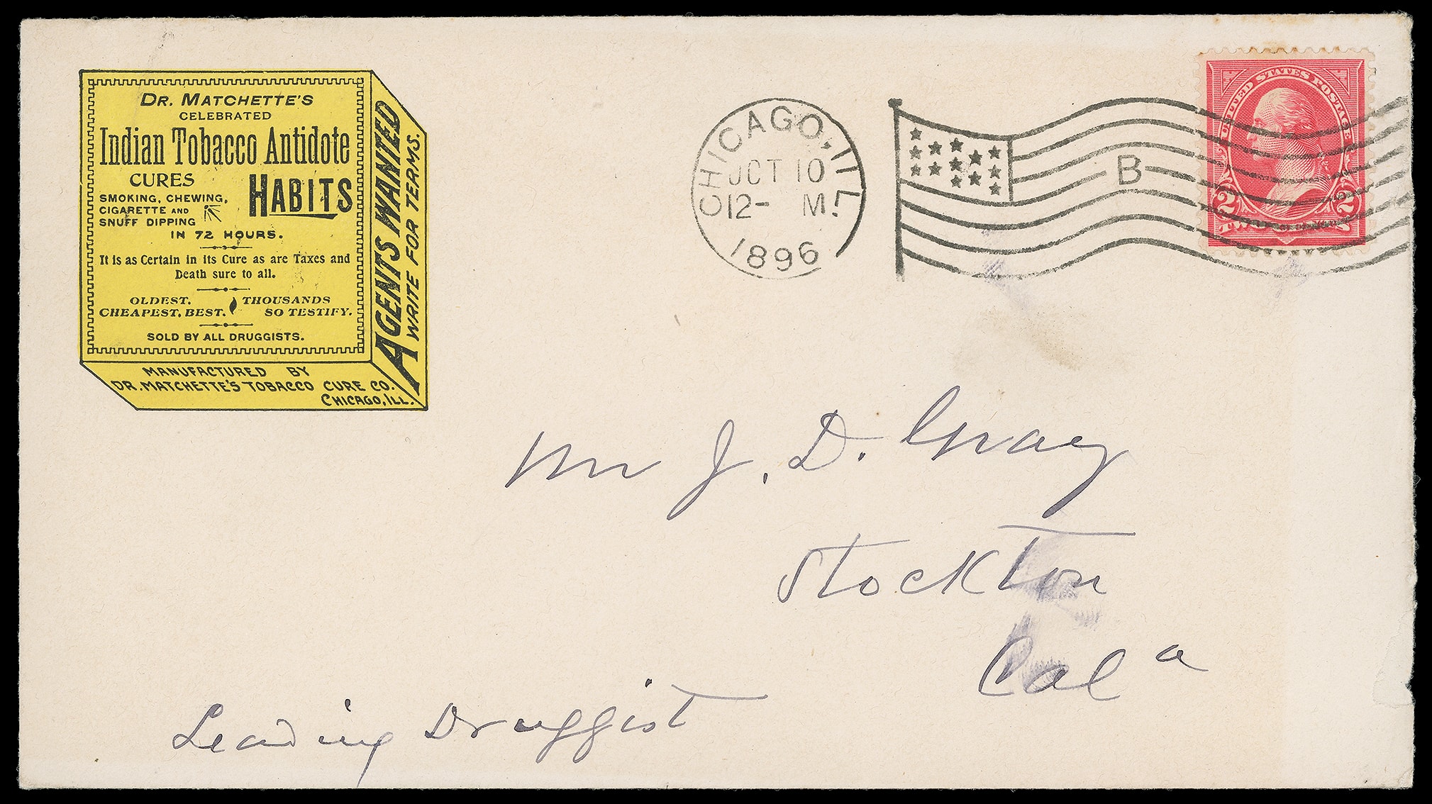 Matchette's Tobacco Cure Co, Chicago Ill. Yellow illustrated advertising showing medicine box for "Indian Tobacco Antidote, Cures all Habits" on cover bearing 2¢ red (267) tied by "Chicago, Ill. Oct 10, 1896" flag machine cancel to Stockton