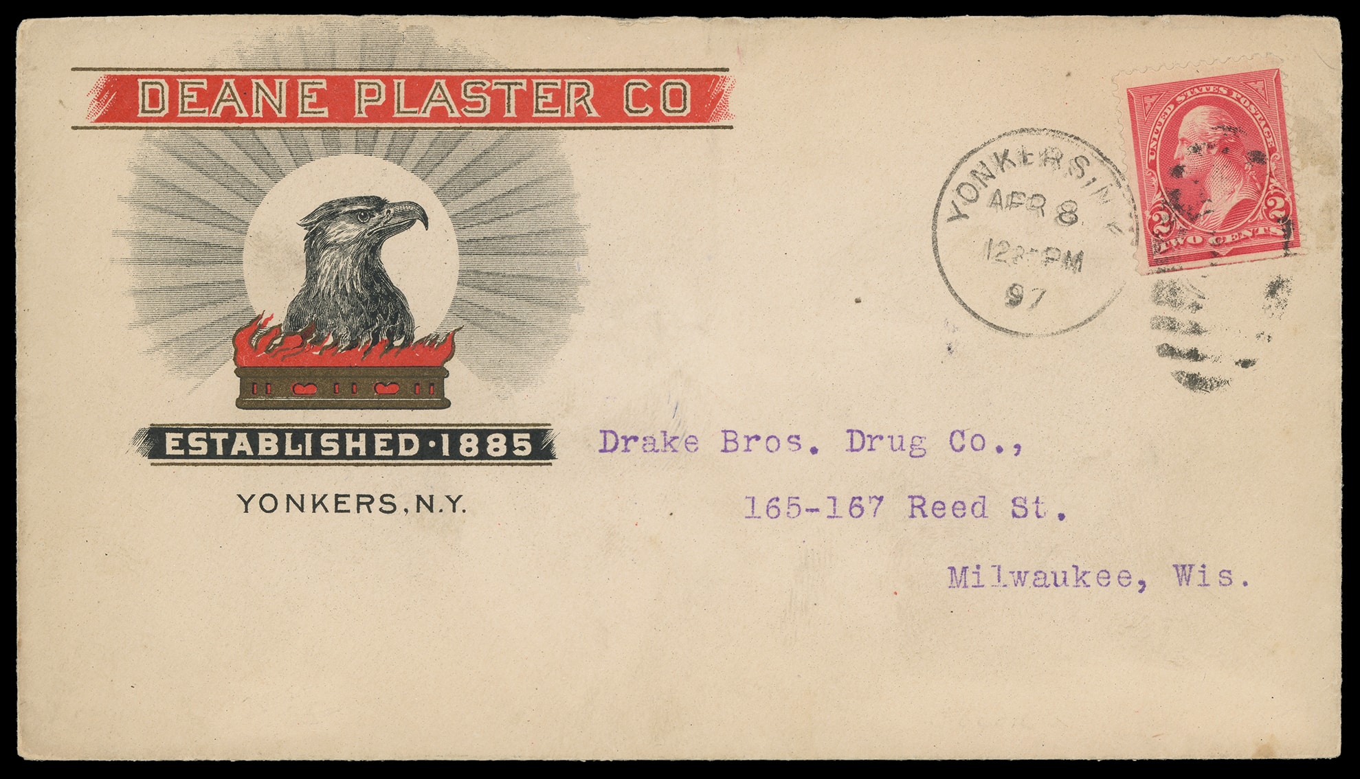 Plaster Co. Yonkers N.Y. Bicolored illustrated design showing eagle on 1897 cover bearing 2¢ rose carmine (267), nat. s.e., tied by "Yonkers, N.Y. Apr 8 '97" duplex to Milwaukee, Wisc., Very Fine. Estimate; $50 - 75. (Image1)