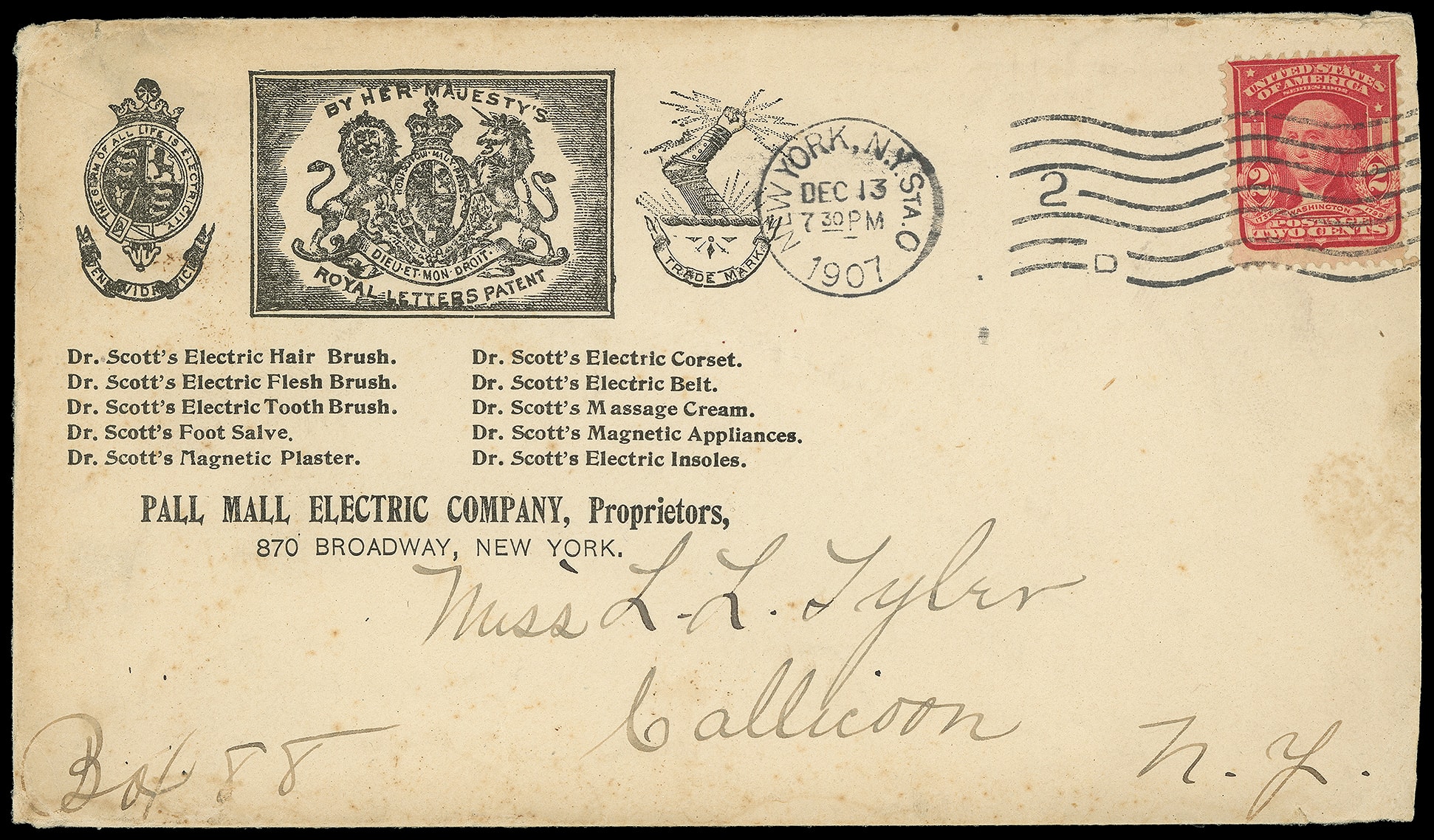 2¢ carmine (319) tied by "New York, N.Y. Sta. O, Dec 13, 1907" machine cancel to Callicoon N.Y.; barely reduced at right, light edge wear, Fine and most unusual early medical electrical cover. Estimate; $75 - 100. (Image1)