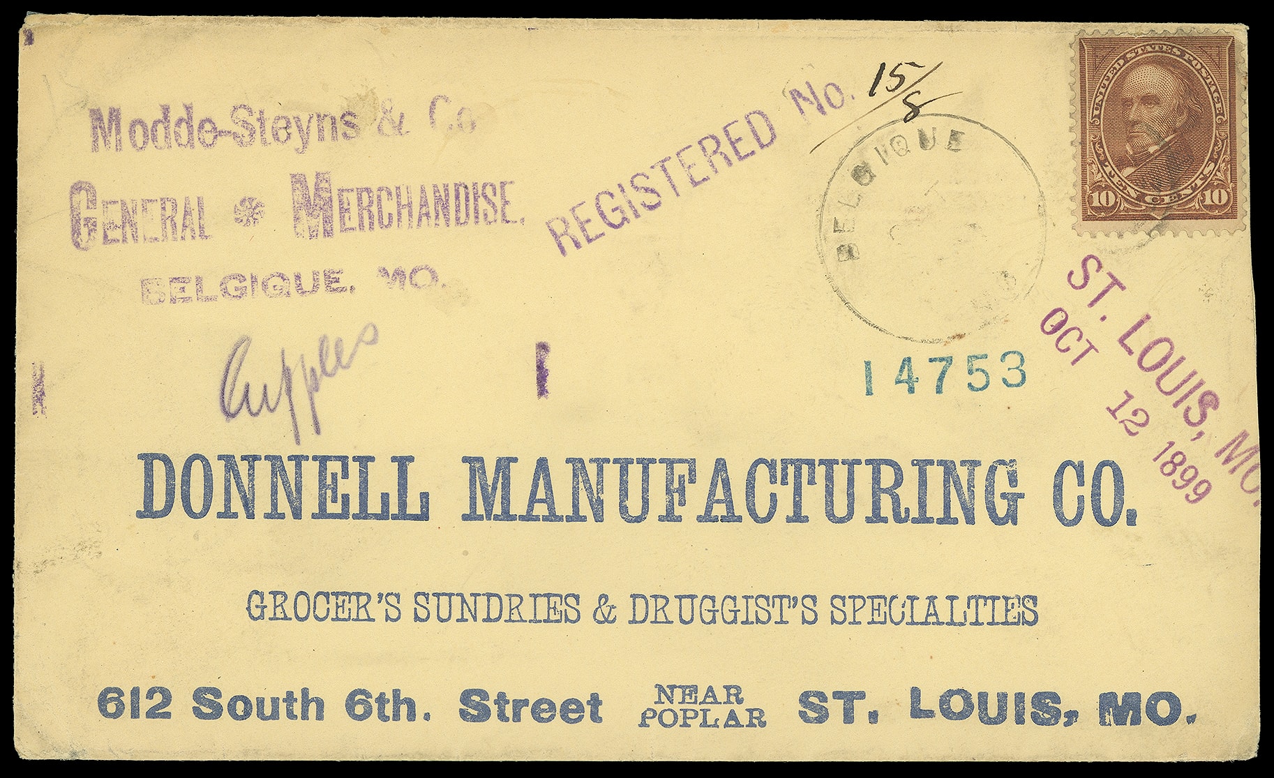 to St. Louis, purple "St. Louis, Mo., Oct 12, 1899" two-line postmark and "Registered No." straightline; some soiling and wear, reduced slightly at right, F.-V.F. Estimate; $75 - 100. (Image1) (Image2)
