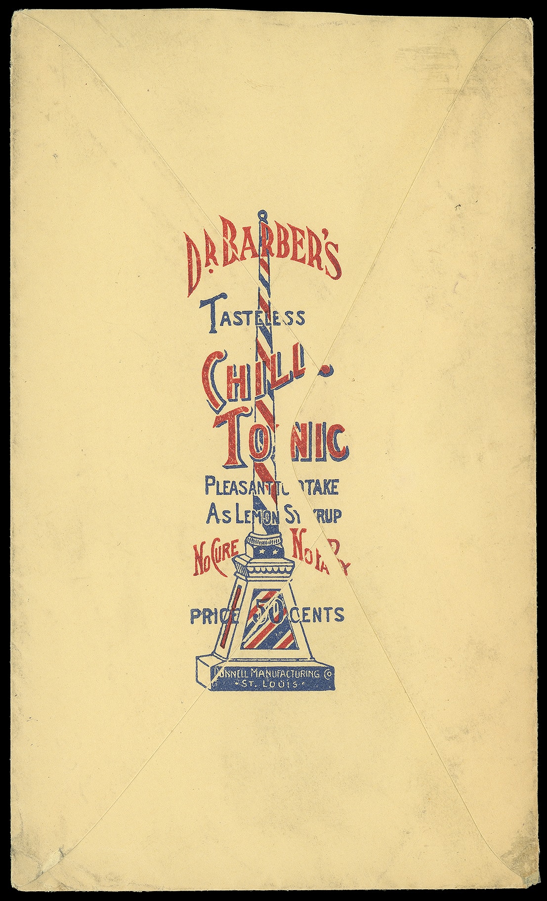Barber's Tasteless Chill Tonic, Donnell Manfacturing Co. St. Louis, Mo. Red and blue illustrated printed advertising on reverse, blue printed return address on registered return cover bearing 10¢ brown (282C) tied by "Belgigue, Mo." duplex