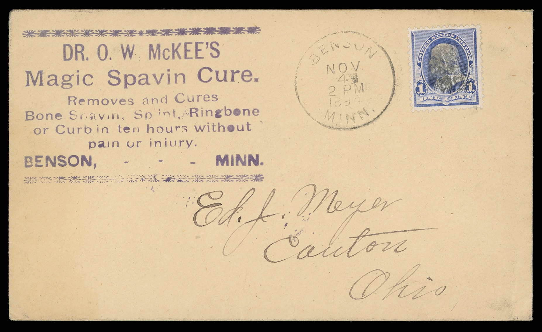 McKee's Magic Spavin Cure, Benson Minn. Blue fancy handstamp corner card, additional strike on reverse of unsealed buff cover bearing 1¢ blue (219) canceled by cork duplexed with "Benson Minn. Nov 4, 1894" cds to Canton Oh., Very