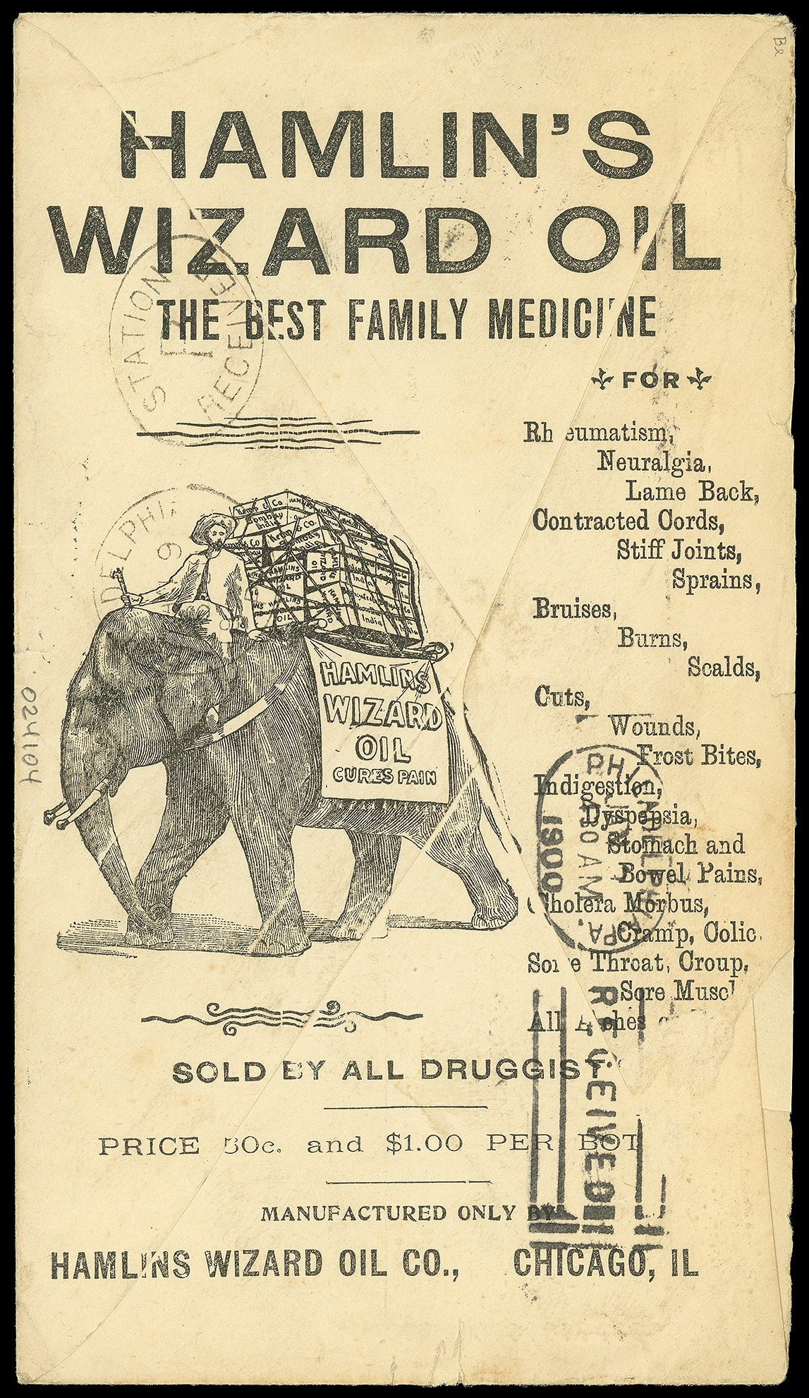 receiving backstamp; small edge tears, mended nick with bit of flap missing, Fine appearance, a scarce medical elephant ad. Estimate; $100 - 150. (Image1) (Image2)