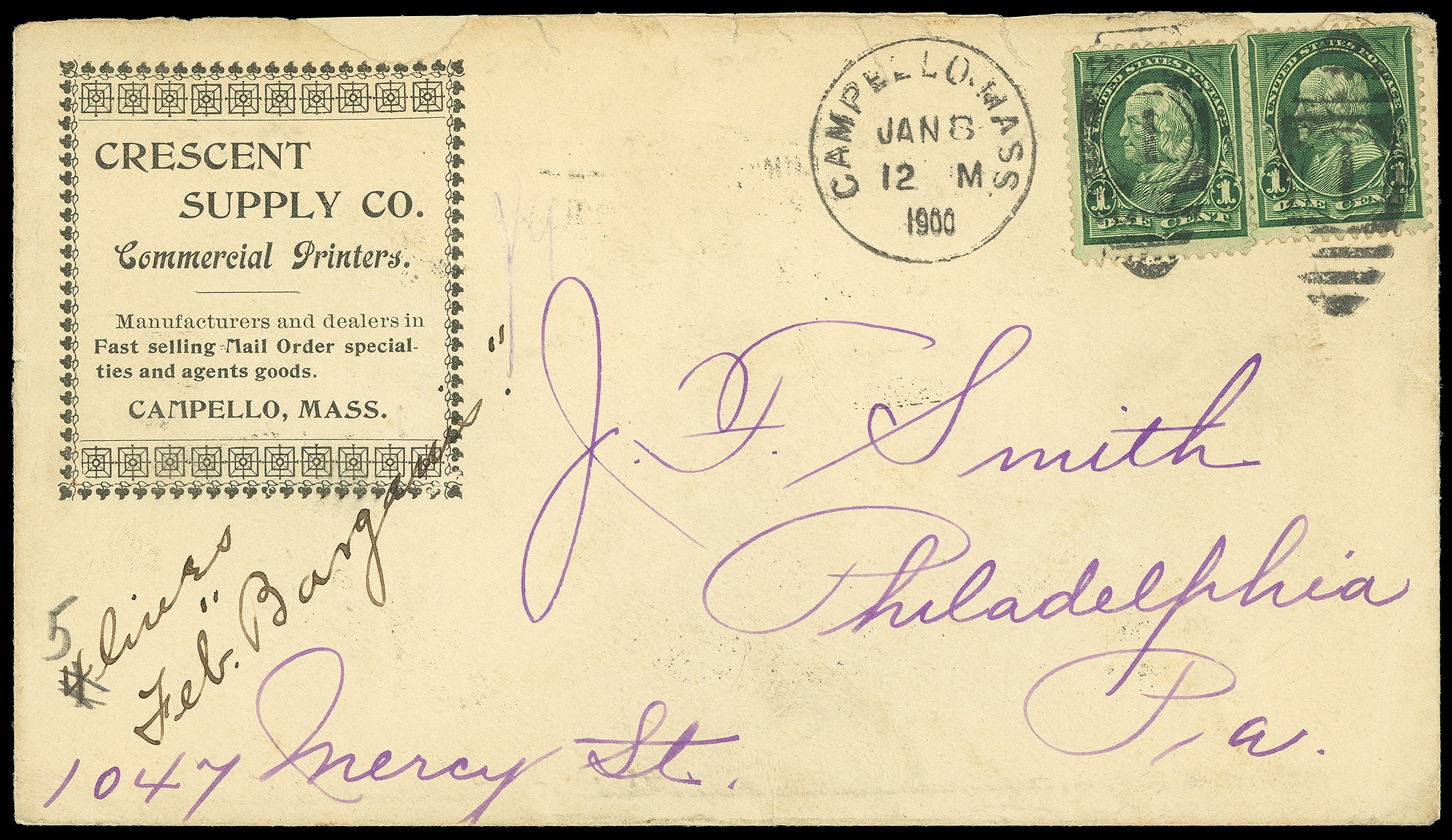 Wizard Oil, Chicago Ill. Oval illustrated advertising showing elephant on reverse of Crescent Supply Co. corner card cover bearing 1¢ green (279) pair tied by "Campello, Mass. Jan 8, 1900" duplex to Philadelphia Pa., machine