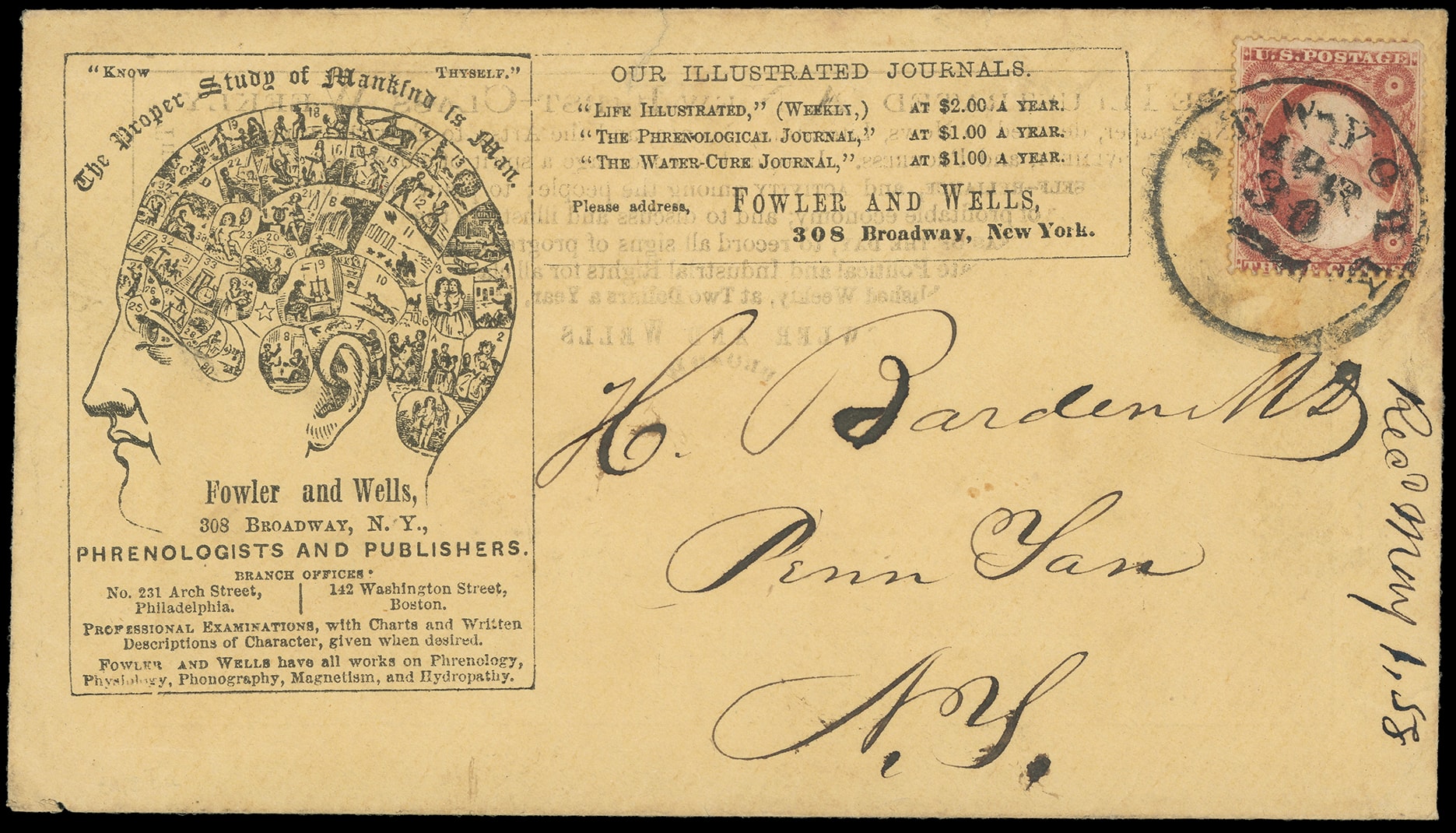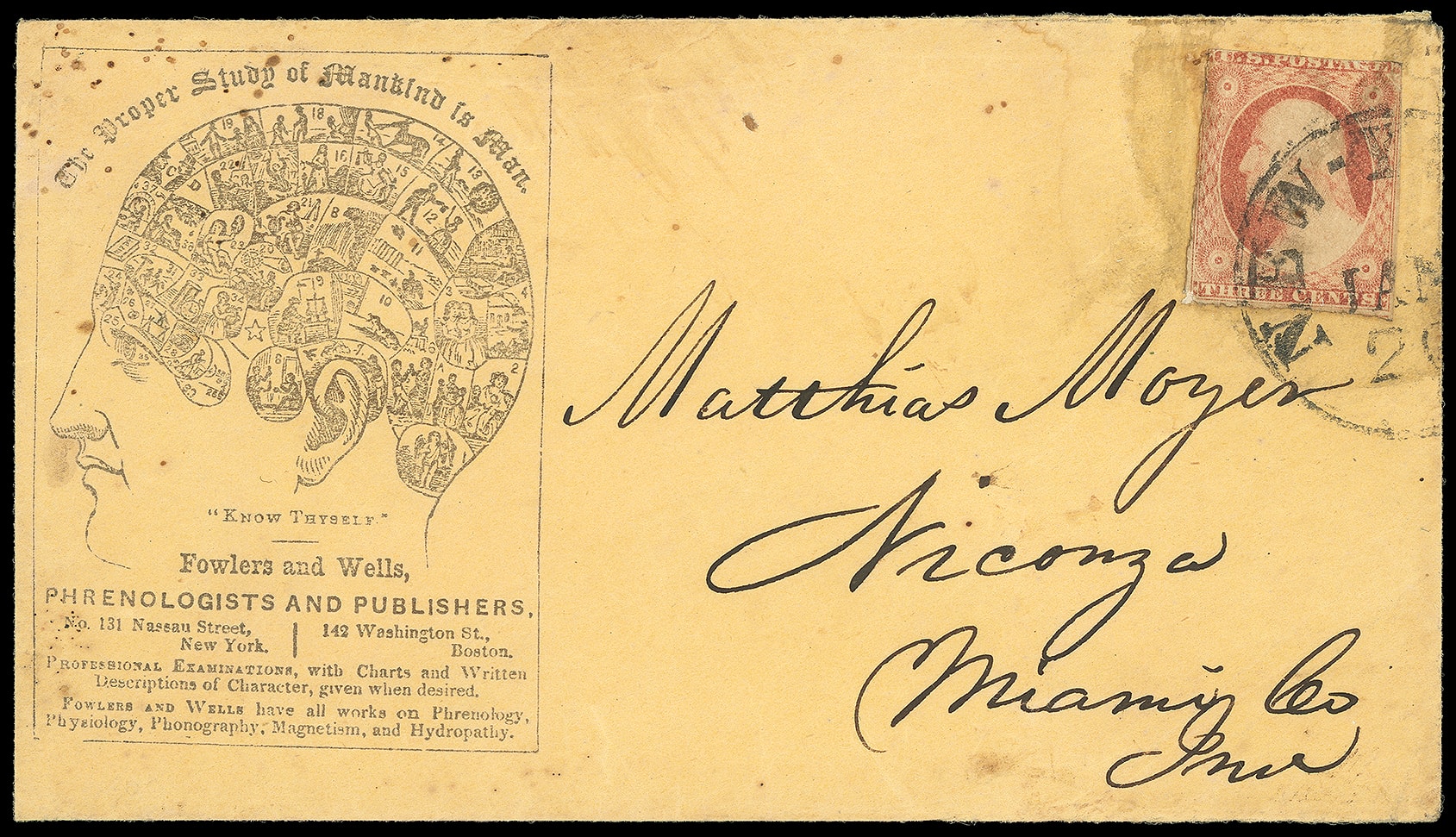 and Wells, Phrenologists & Publishers, New York N.Y. Illustrated ad design showing Skull with Partitioned "Brain Organs" on buff cover bearing 3¢ dull red (11A) tied by "New-York, Jan 20" cds to Niconza, Indiana; soiling and wear,