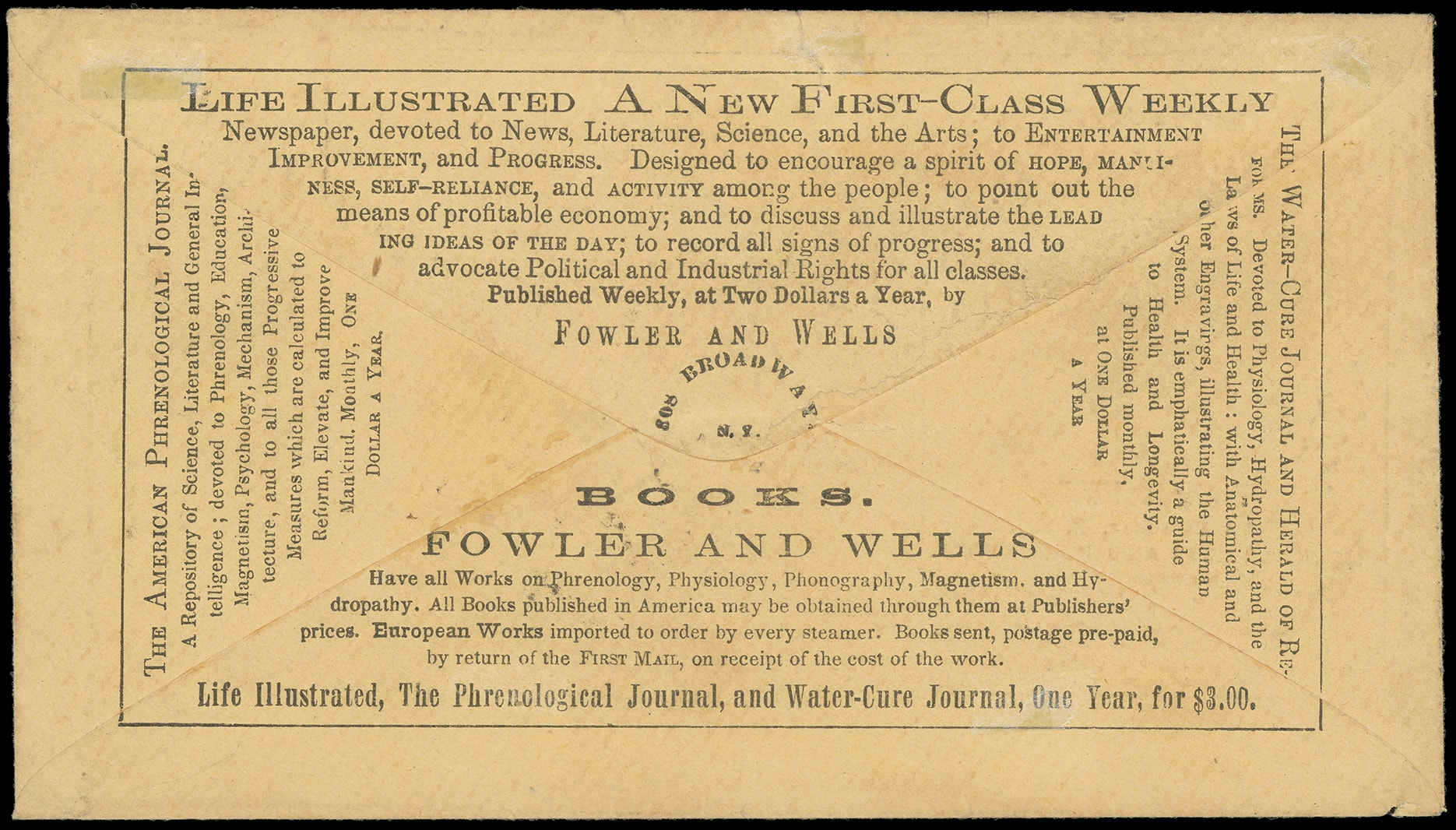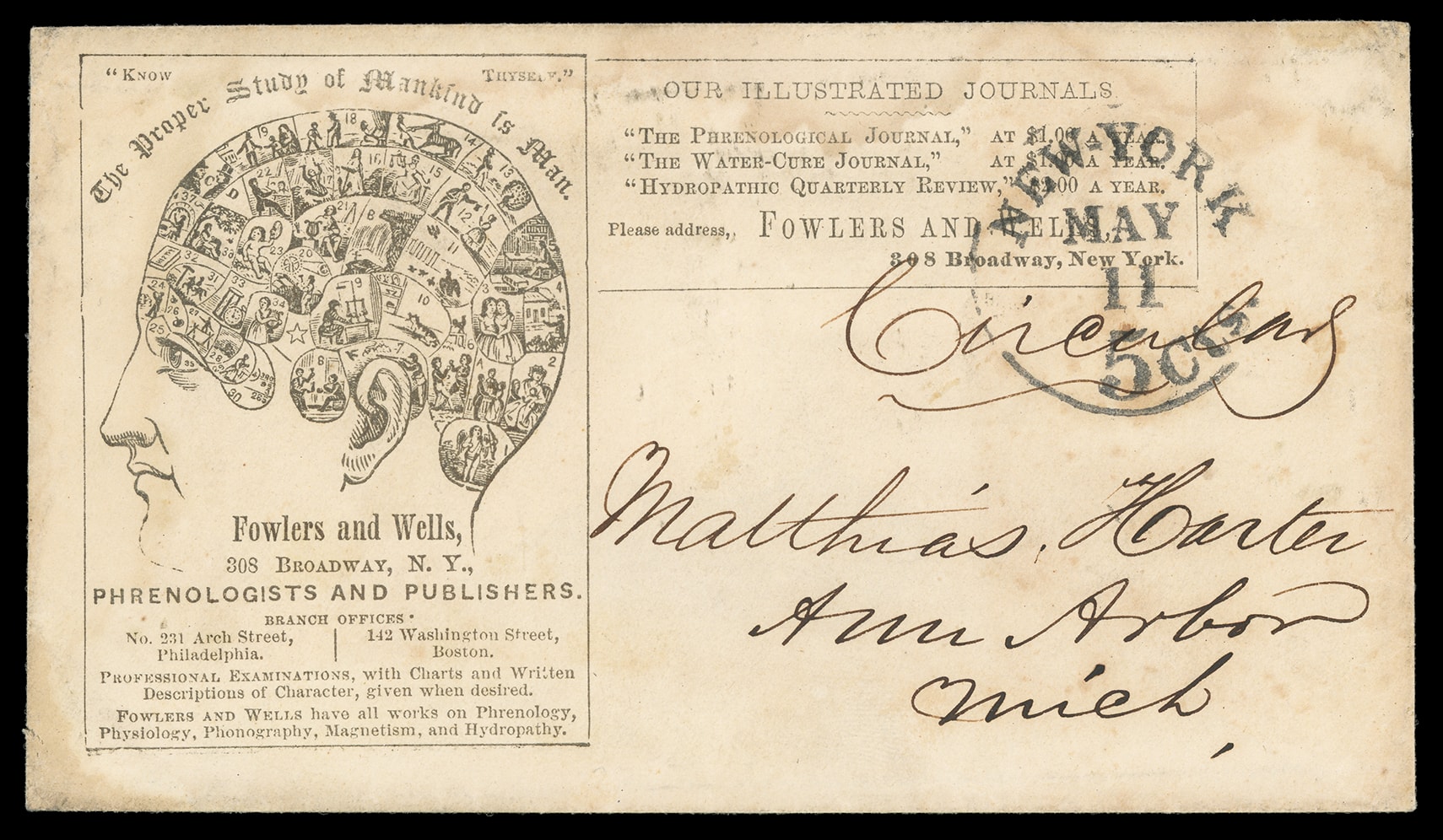 Wells, Phrenologists & Publishers. Illustrated black ad design showing Skull with Partitioned "Brain Organs" on cover with "New-York, 5cts., May 11" integral-rate cds to Ann Arbor, Michigan; light water staining, F.-V.F. Estimate; $150