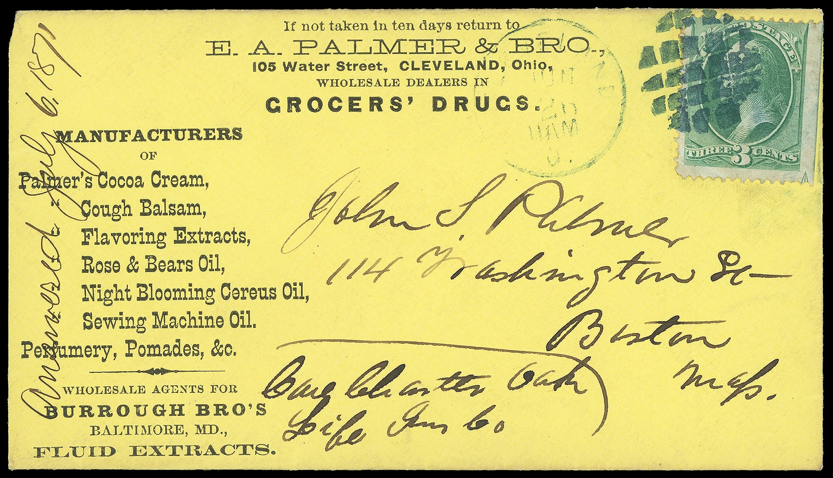 Palmer & Bro., Grocers' Drugs, Cleveland, Ohio. Printed advertising as Manufacturers of Palmer's Cocoa Cream, Cough Balsam, etc on yellow cover bearing 3¢ green (147) arrow s.e., tied by segmented circular grid cancel duplexed with