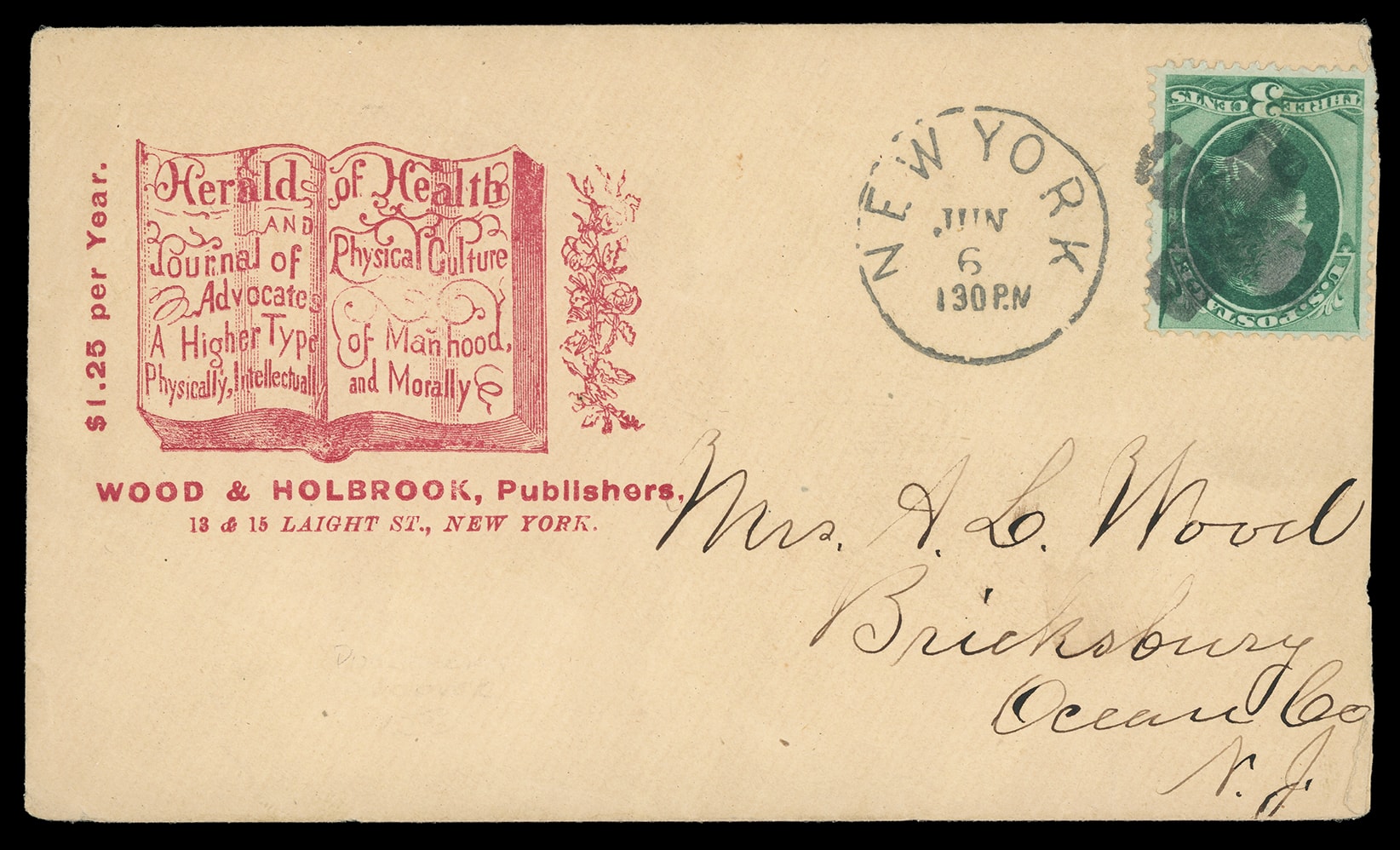 Health, Wood & Holbrook Publishers, New York N.Y. Red illustrated corner card showing open book on buff cover bearing 3¢ green (158) tied by cross duplexed with "New York, Jun 6" cds to Bricksbury N.J.; reduced at right,
