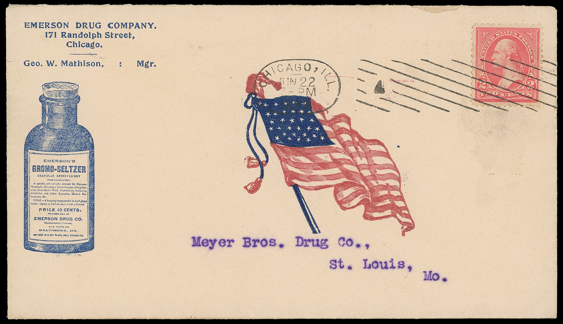 Bromo-Seltzer, Emerson Drug Co., Chicago Ill. Blue illustrated design with additional patriotic red and blue flag at right on amber cover bearing 2¢ (279B) tied by "Chicago Ill Jun 22 1898" machine cancel, Extremely Fine to Superb Spanish