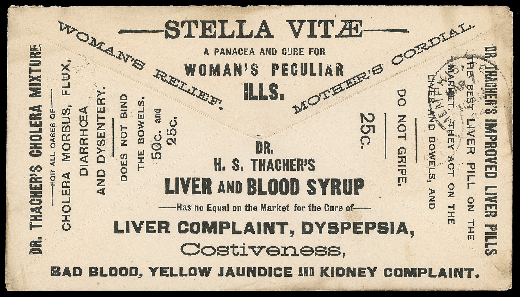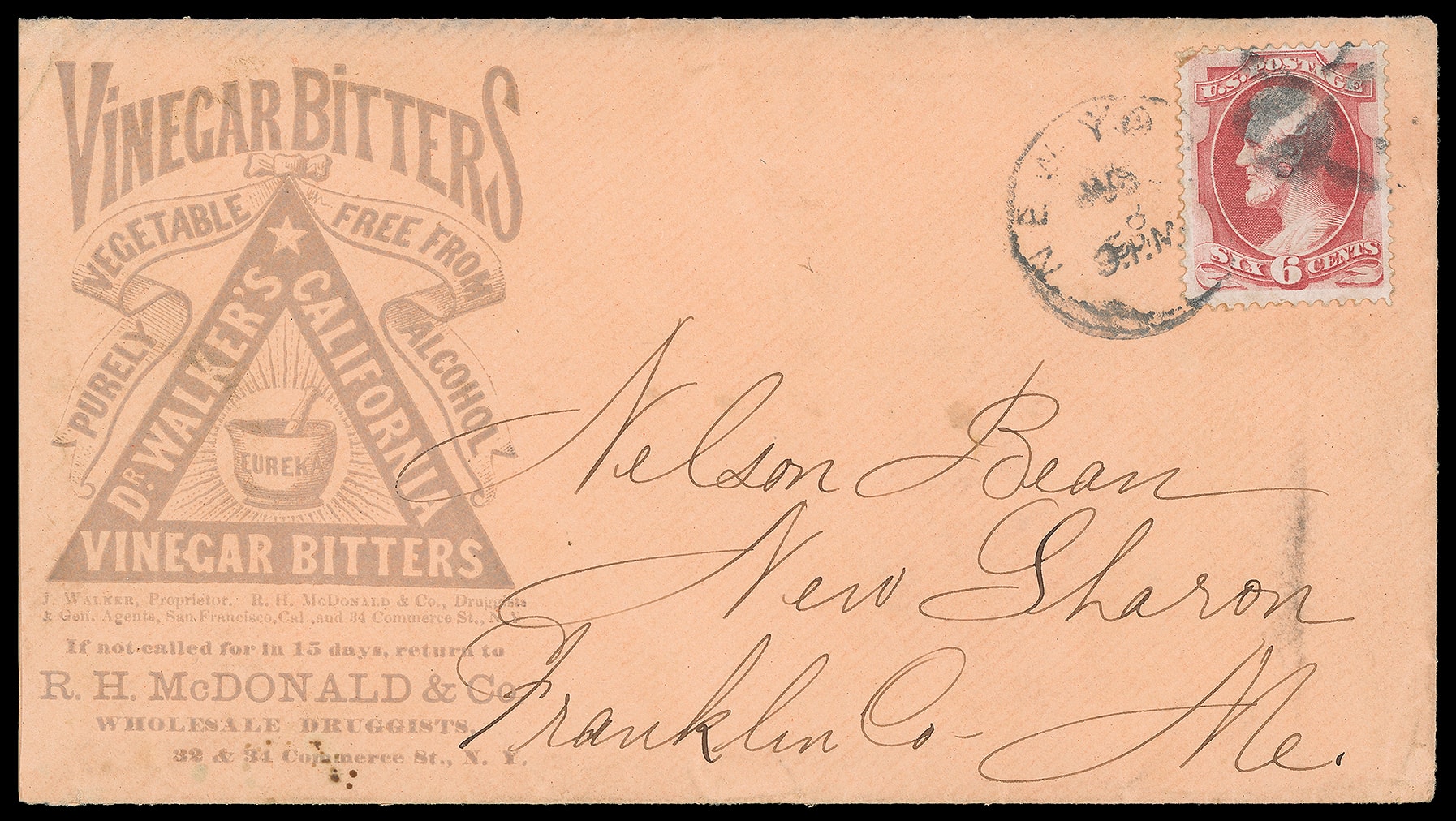 Walker's California Vinegar Bitters, R.H. McDonald & Co, New York N.Y. Illustrated gray advertising on salmon cover bearing 6¢ carmine (148) tied by patent cork cancel duplexed with "New York, Mar 6" cds to New Sharon, Me.; reduced slightly