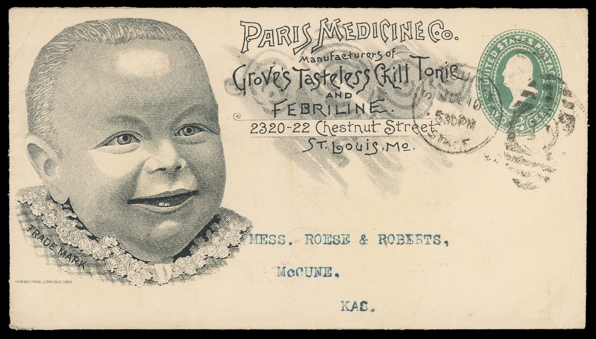 Tasteless Crill Tonic and Febriline, Paris Medicine Co., St. Louis Mo. Large illustrated advertising showing baby head with additional red advertising on reverse of 2¢ green entire canceled by "St. Louis, Sta. K, Jul 10 '97" duplex to